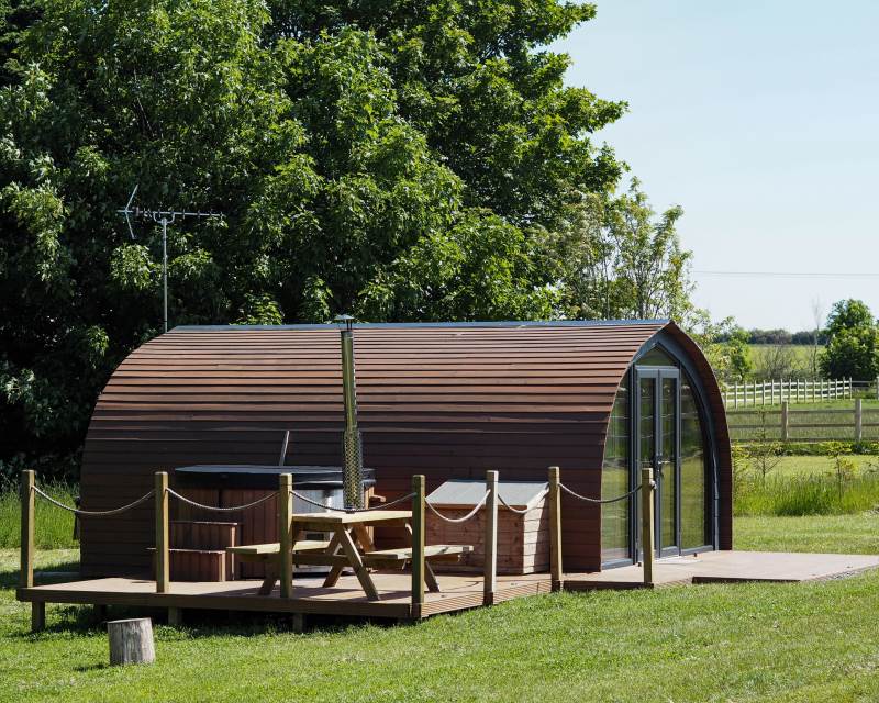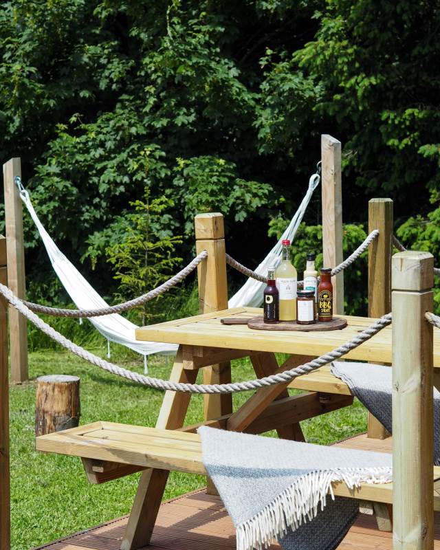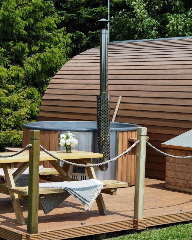 Outside each Glamping Pod, there is a decked area with outdoor seating/hammock and a BBQ fire pit- which is perfect for roasting marshmallows and al fresco dining. Relax in your own private area with the log-fired hot tub (the heat is generated through a log burner for an extremely authentic and luxurious experience).