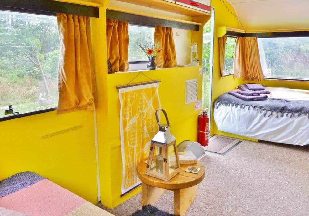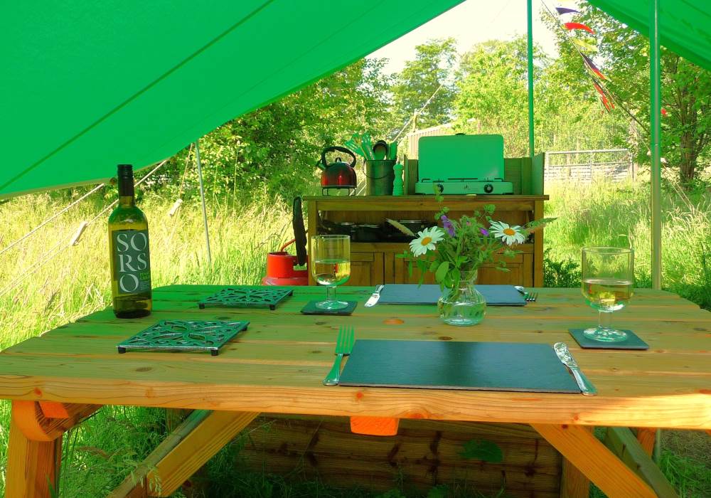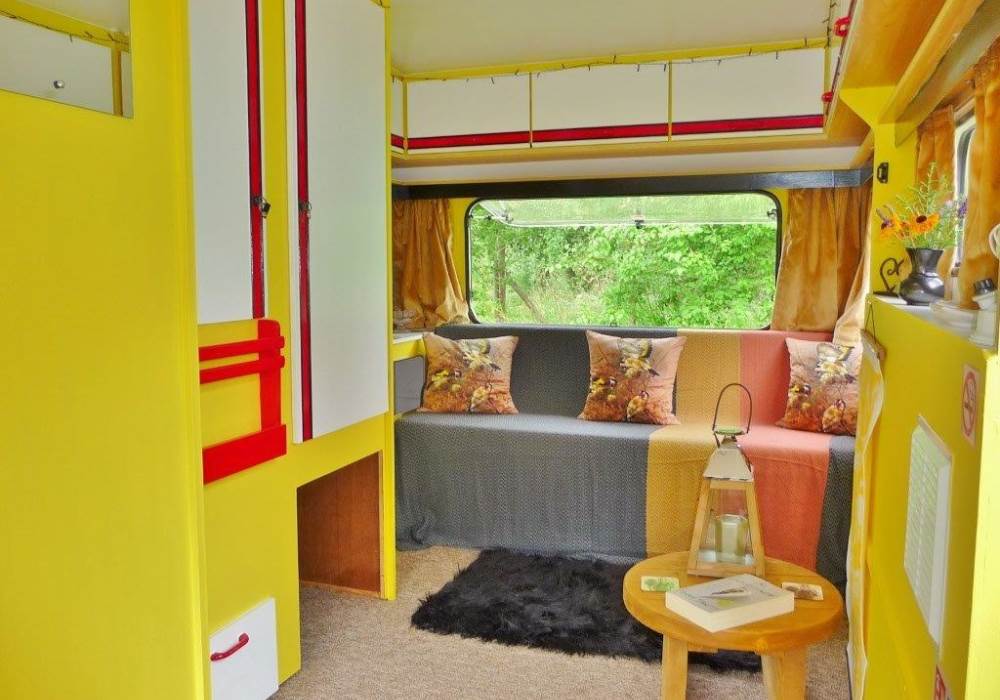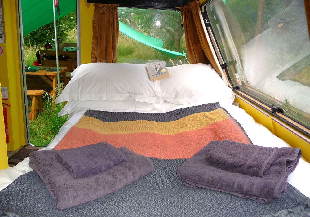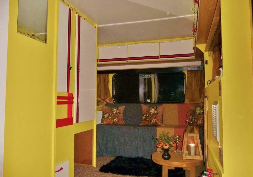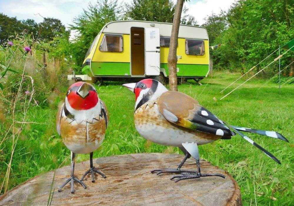 Goldfinch Glampavan was once a touring caravan made in the 1980s. It has now been lovingly repositioned in our orchard area and given a quirky twist to become a glampavan. It is furnished and decorated in the bright, beautiful colours of this pretty garden bird. There is a small double bed inside, plus somewhere to sit by the candlelight during the evening while outside you will find a field kitchen with seating. Sleeping two adults and up to one child (age range 5-12), Goldfinch Glampavan is available from May to September.