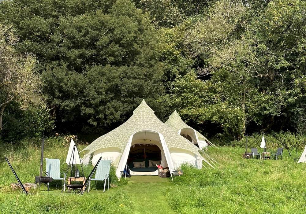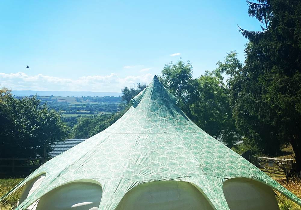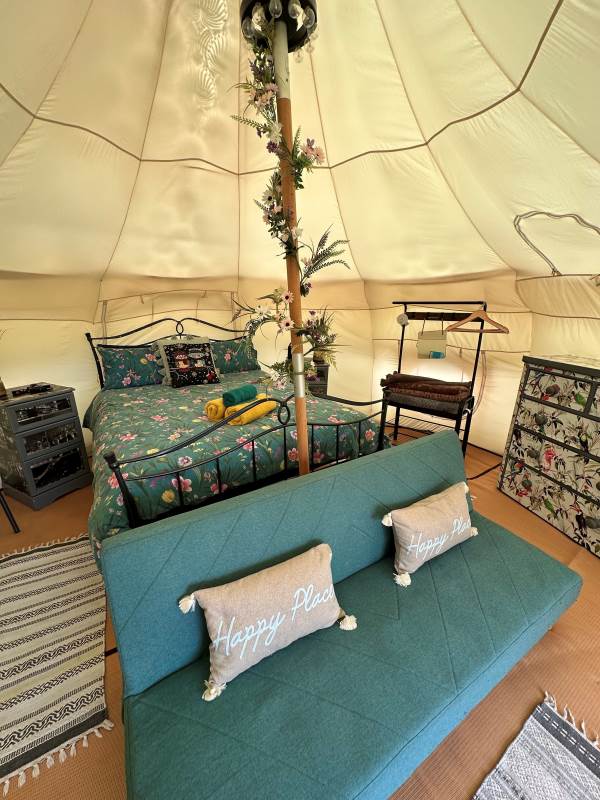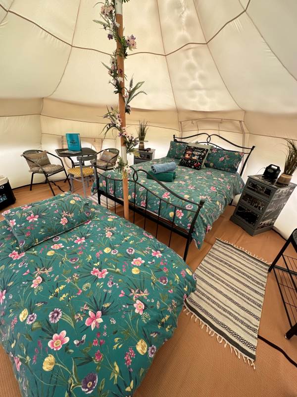 Lotus Belles are surprisingly spacious with plenty of room to move around and stand up, its nothing like camping! They have a roomy porch area which further extends the living area and is ideal for outdoor clothes, muddy boots etc, and they are topped with a leafy green cover to protect the bats and wildlife from any light spill. (we even have a Lesser Horseshoe Bat roost in one of barns with a Bat Bench to watch them leave at dusk which is quite spectacular)