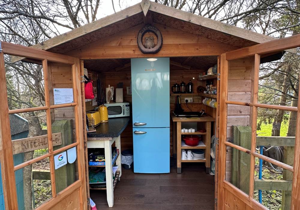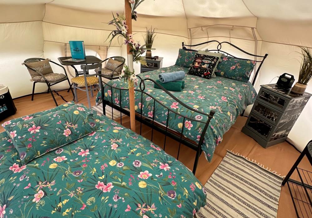 The tents are equipped with Crockery, Cutlery, pans etc along with a large cool box to keep your Prosecco cold on the warm evenings. There is an ordnance survey map of the local area and a pair of mini binoculars for wildlife spotting (lots of squirrels, rabbits, badgers, foxes, pheasants, many types of birds and of course Owls live in and around Owley Woods)