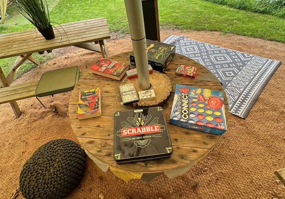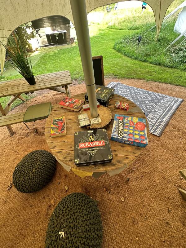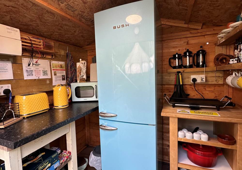 The tents are equipped with Crockery, Cutlery, pans etc along with a large cool box to keep your Prosecco cold on the warm evenings. There is an ordnance survey map of the local area and a pair of mini binoculars for wildlife spotting (lots of squirrels, rabbits, badgers, foxes, pheasants, many types of birds and of course Owls live in and around Owley Woods)