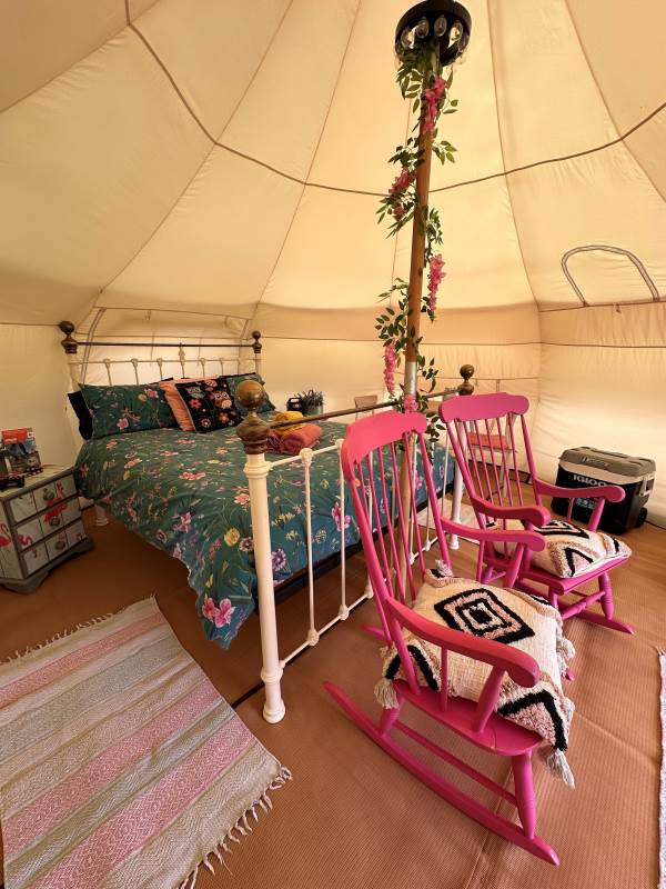 Lotus Belles are surprisingly spacious with plenty of room to move around and stand up, its nothing like camping! They have a roomy porch area which further extends the living area and is ideal for outdoor clothes, muddy boots etc, and they are topped with a leafy green cover to protect the bats and wildlife from any light spill. (we even have a Lesser Horseshoe Bat roost in one of barns with a Bat Bench to watch them leave at dusk which is quite spectacular)