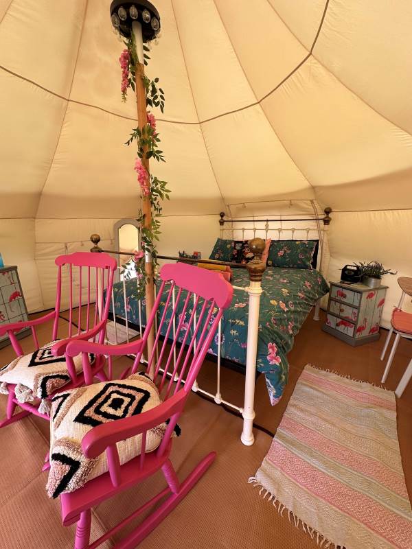 With far reaching views over Somerset Adult only Bubo Belle is colourful and cosy, with rugs, throws, cushions and a king-size bed with luxury bedding, towels and even hot water bottles. There are drawers to store your clothes, rocking chairs to relax in and a table and chairs for indoor dining, all finished with those extra luxury touches and of course bunting and fairy lights.