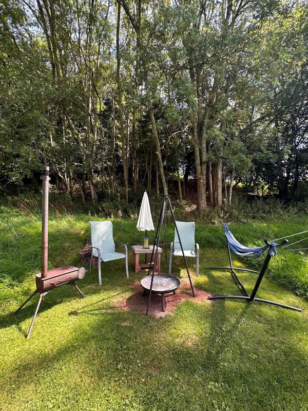 Outside you have a private seating area with comfy chairs and table, a hammock and wood fired stove to boil a kettle or cook breakfast on. To keep you warm and cosy on the cooler evenings, each tent has a fire pit with hanging grill for that essential BBQ.