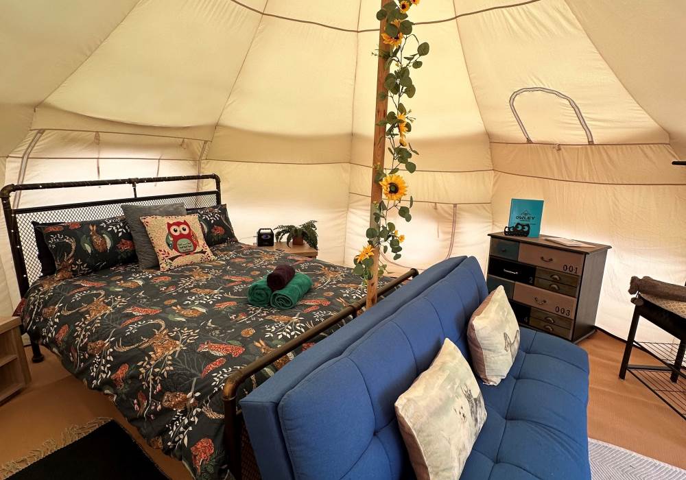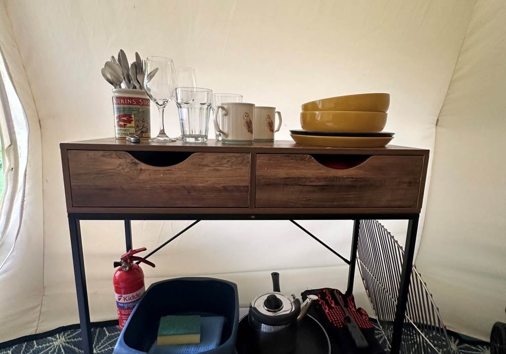 The tents are equipped with Crockery, Cutlery, pans etc along with a large cool box to keep your Prosecco cold on the warm evenings. There is an ordnance survey map of the local area and a pair of mini binoculars for wildlife spotting (lots of squirrels, rabbits, badgers, foxes, pheasants, many types of birds and of course Owls live in and around Owley Woods)
