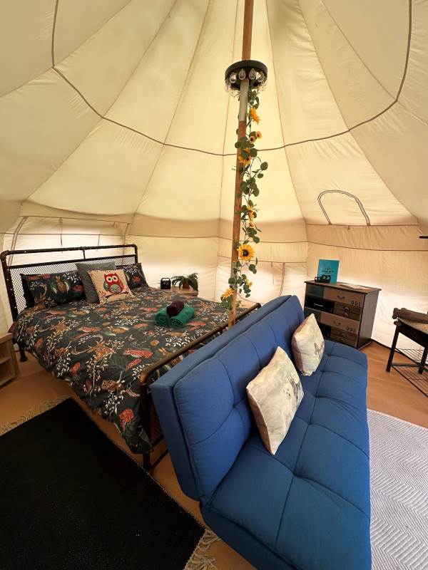 Lotus Belles are surprisingly spacious with plenty of room to move around and stand up, its nothing like camping! They have a roomy porch area which further extends the living area and is ideal for outdoor clothes, muddy boots etc, and they are topped with a leafy green cover to protect the bats and wildlife from any light spill. (we even have a Lesser Horseshoe Bat roost in one of barns with a Bat Bench to watch them leave at dusk which is quite spectacular)