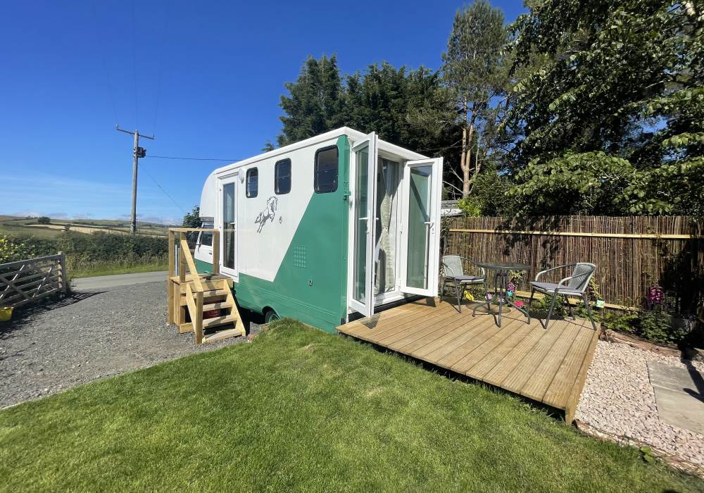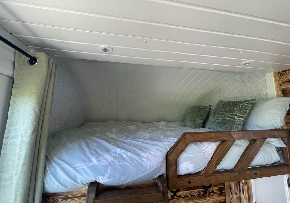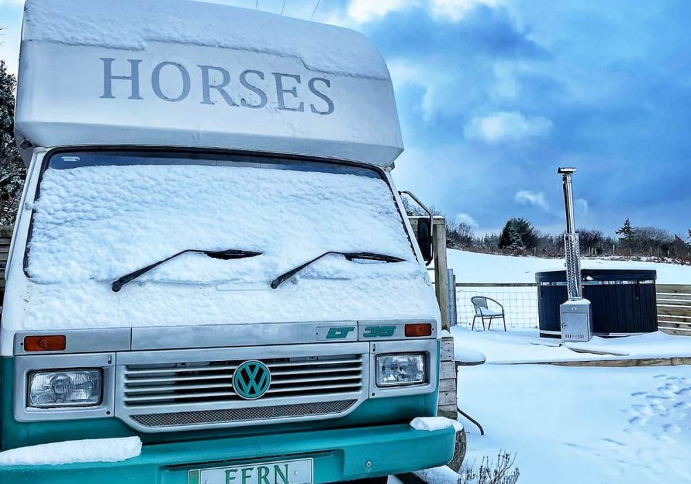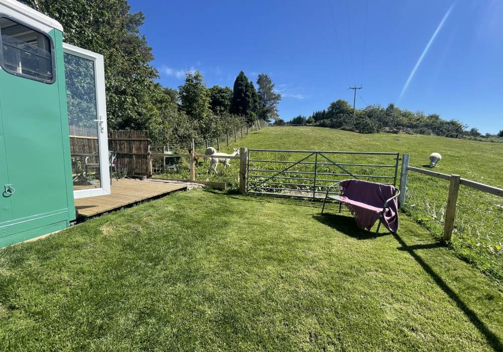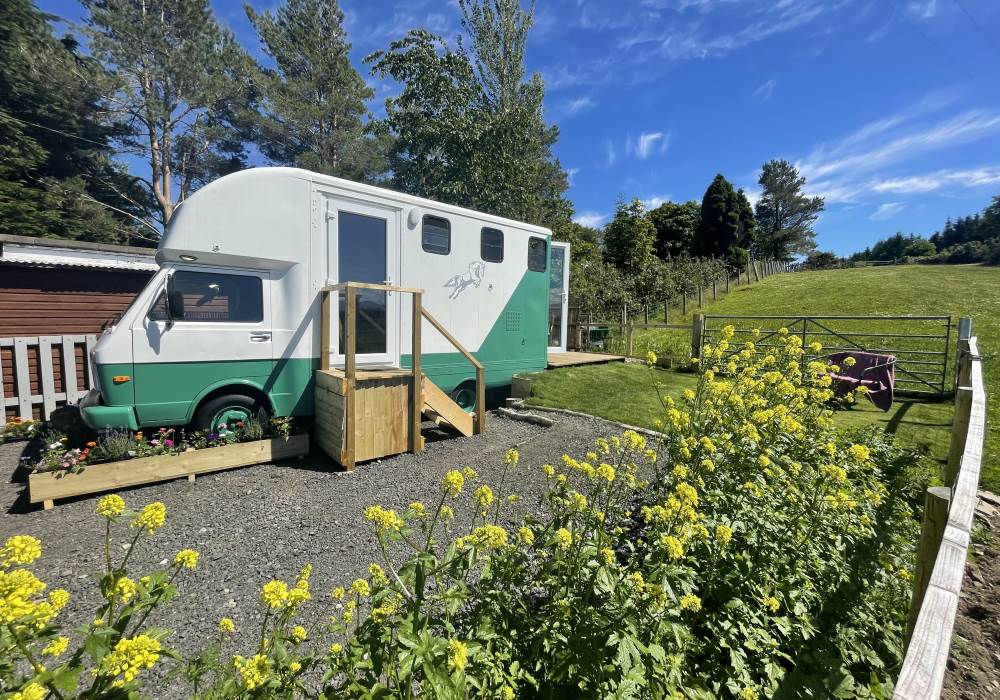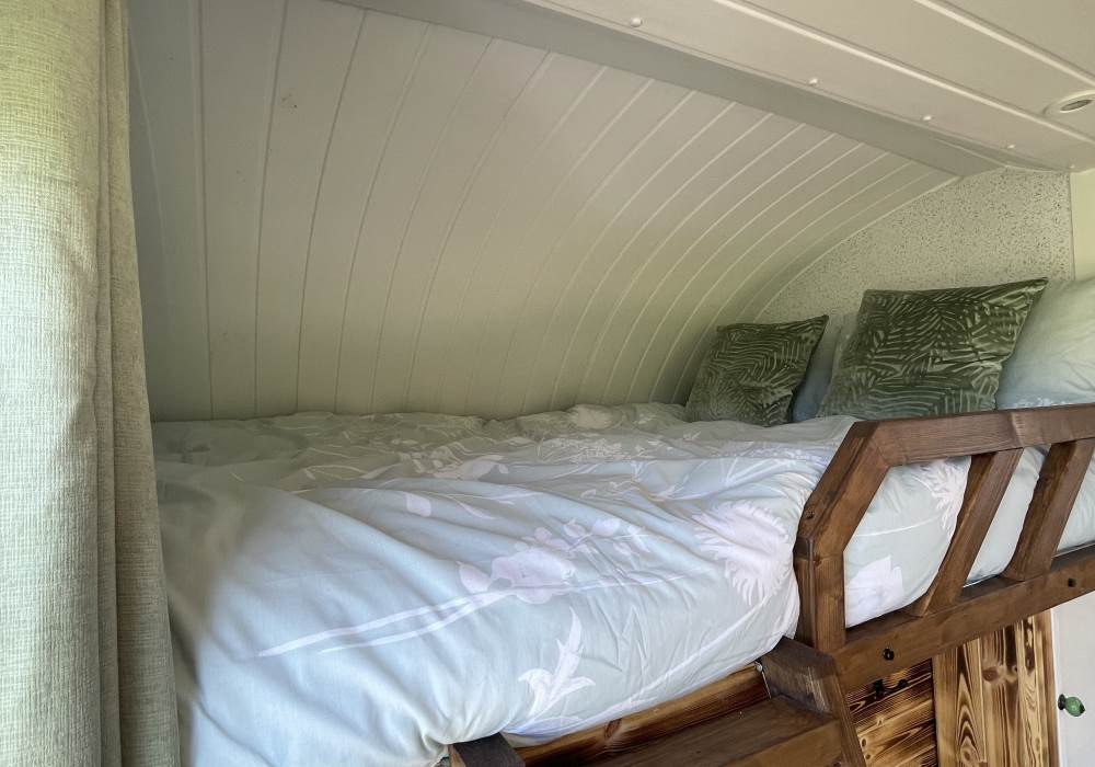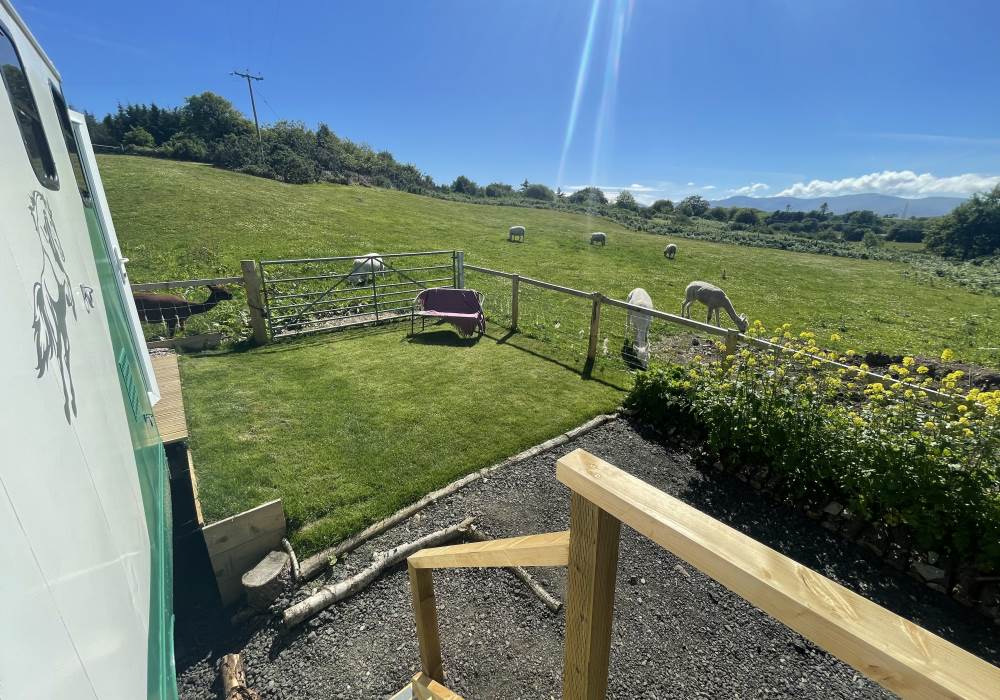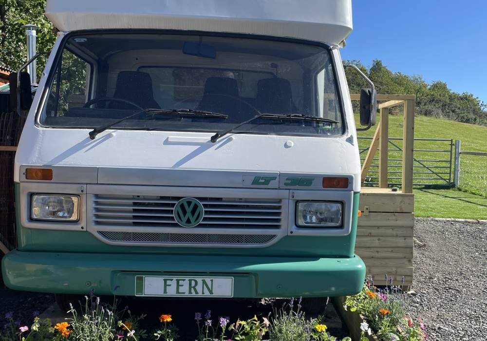 Fern is our lovingly comfy converted 1994 Volkswagen horsebox with a private hot tub, set away from our main glampsite. She has her own gated entrance with a parking area, garden and decking over looking the alpaca paddock and mountains. She also has a newly installed private wood fuelled hot tub, the perfect place to sit and admire the glorious sunsets descend behind the mountain ranges. She sleeps 2 adults in a double bed (sorry no children) or if you need another bed, there is also a fold out small double sofa bed. She has a toilet, shower and kitchen with oven and fridge. Everything you need for a cosy getaway. Please be aware that there are steps to access the horsebox and also a ladder for the bed. Please take a look at the pictures of the bed area.