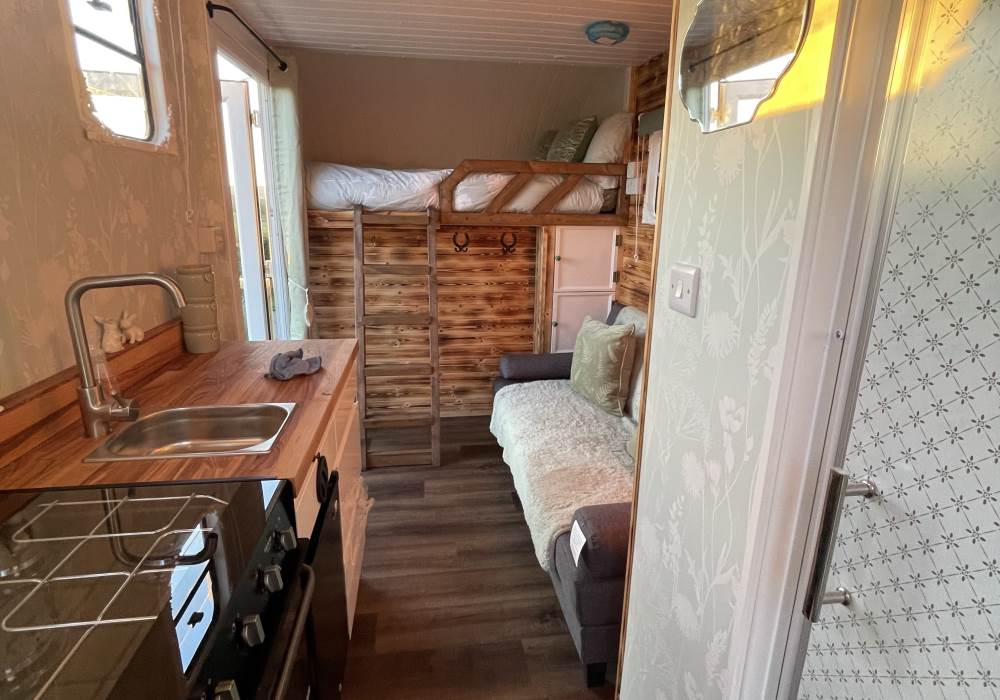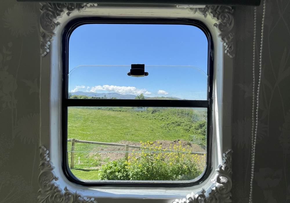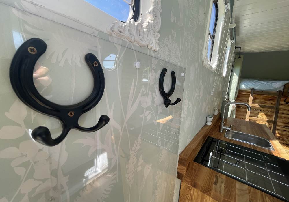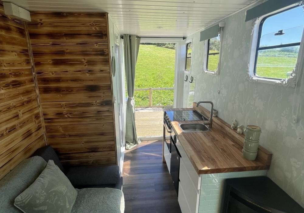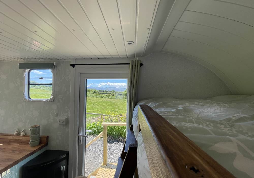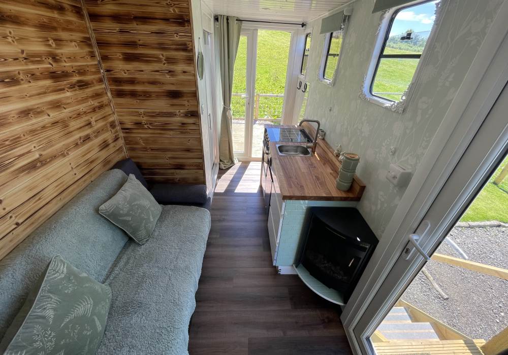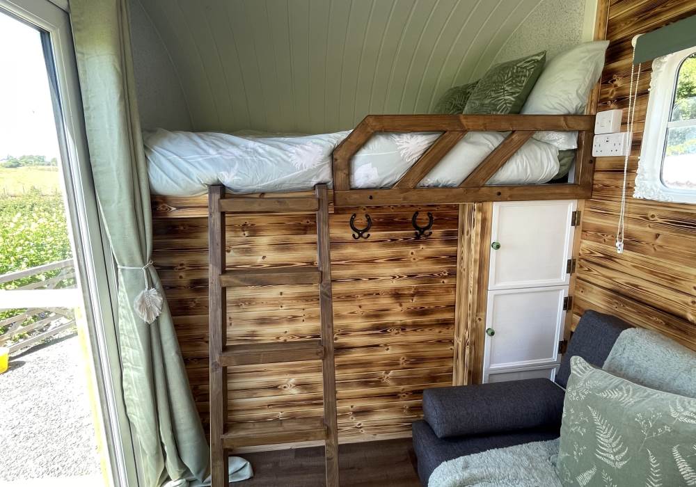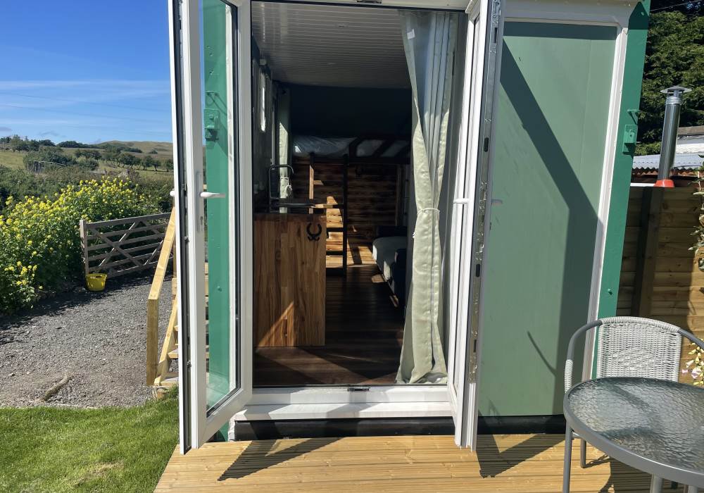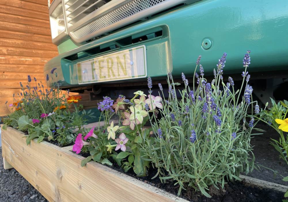 Fern is our lovingly comfy converted 1994 Volkswagen horsebox with a private hot tub, set away from our main glampsite. She has her own gated entrance with a parking area, garden and decking over looking the alpaca paddock and mountains. She also has a newly installed private wood fuelled hot tub, the perfect place to sit and admire the glorious sunsets descend behind the mountain ranges. She sleeps 2 adults in a double bed (sorry no children) or if you need another bed, there is also a fold out small double sofa bed. She has a toilet, shower and kitchen with oven and fridge. Everything you need for a cosy getaway. Please be aware that there are steps to access the horsebox and also a ladder for the bed. Please take a look at the pictures of the bed area.