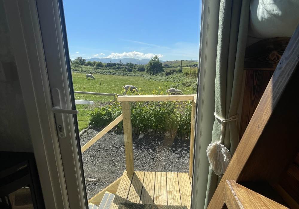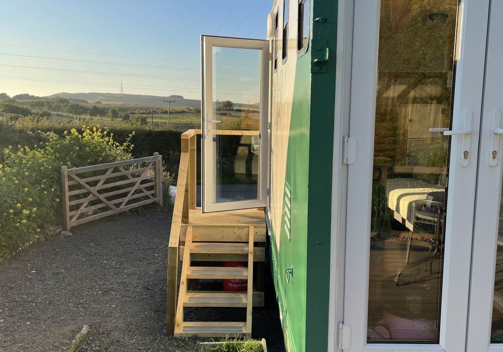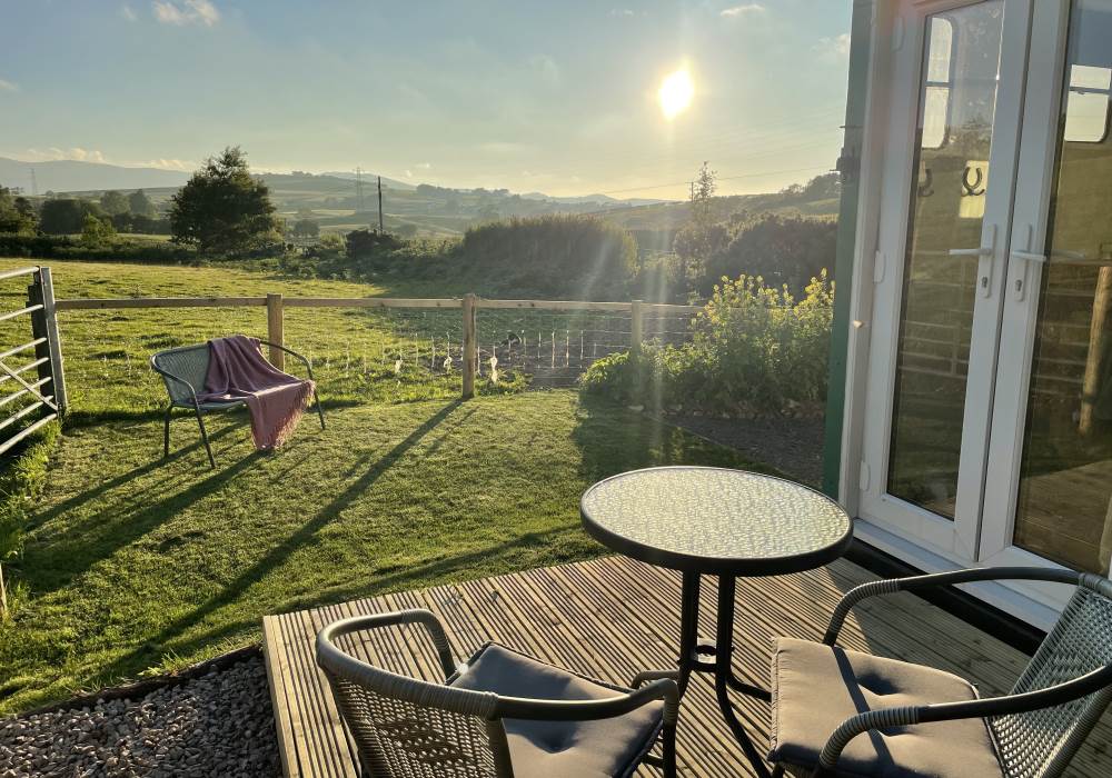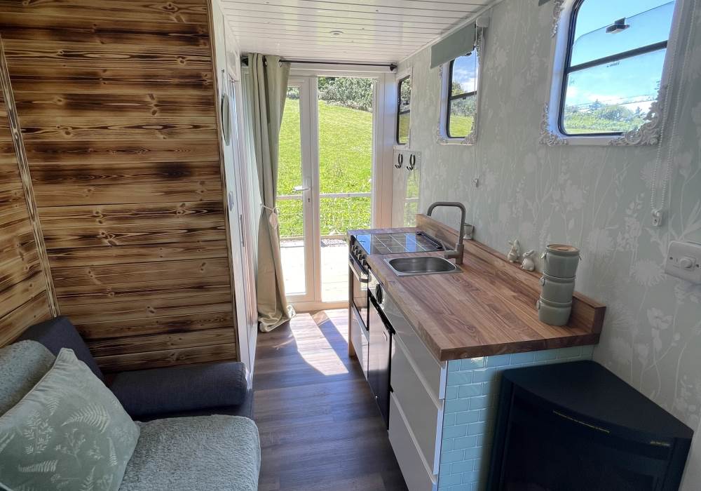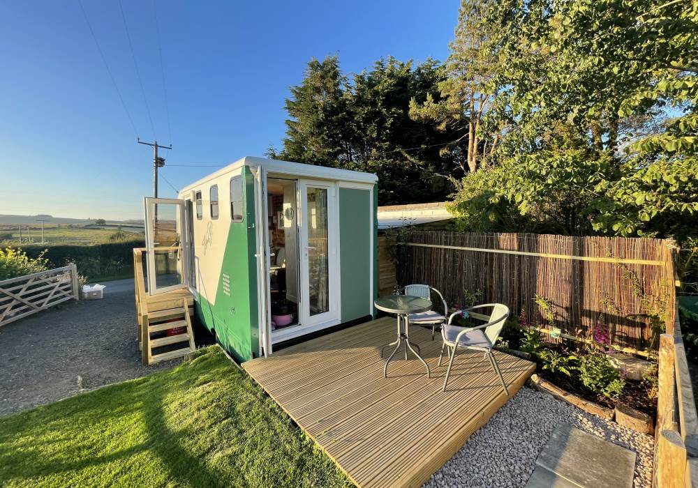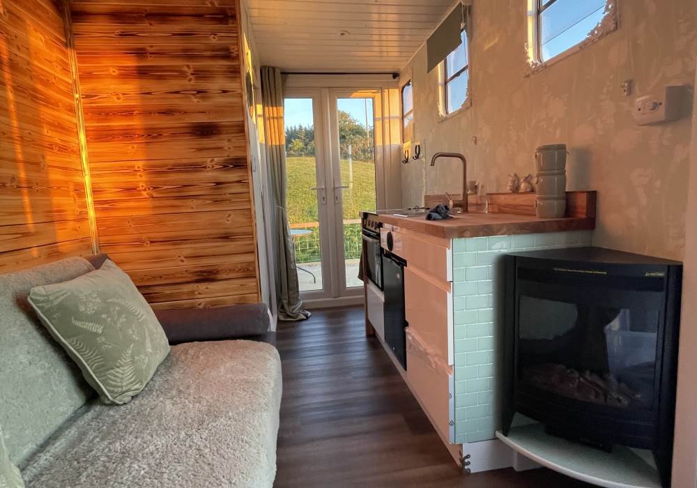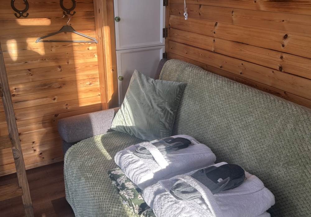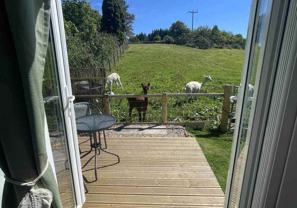 Fern is our lovingly comfy converted 1994 Volkswagen horsebox with a private hot tub, set away from our main glampsite. She has her own gated entrance with a parking area, garden and decking over looking the alpaca paddock and mountains. She also has a newly installed private wood fuelled hot tub, the perfect place to sit and admire the glorious sunsets descend behind the mountain ranges. She sleeps 2 adults in a double bed (sorry no children) or if you need another bed, there is also a fold out small double sofa bed. She has a toilet, shower and kitchen with oven and fridge. Everything you need for a cosy getaway. Please be aware that there are steps to access the horsebox and also a ladder for the bed. Please take a look at the pictures of the bed area.