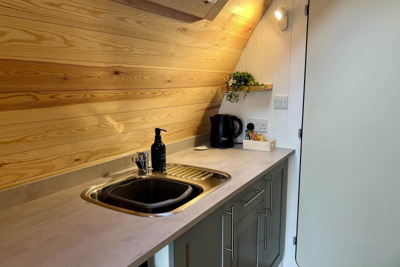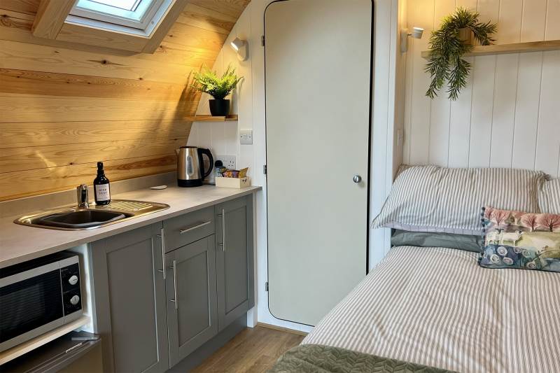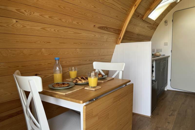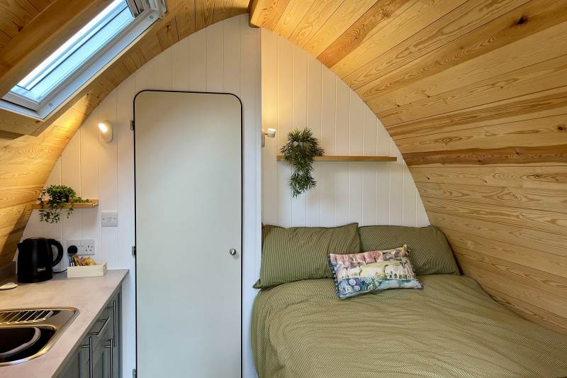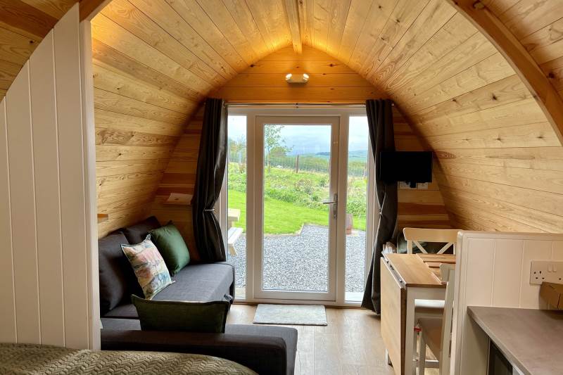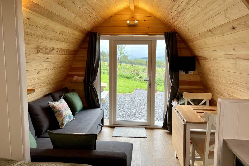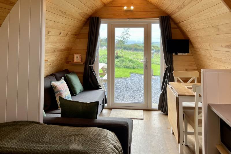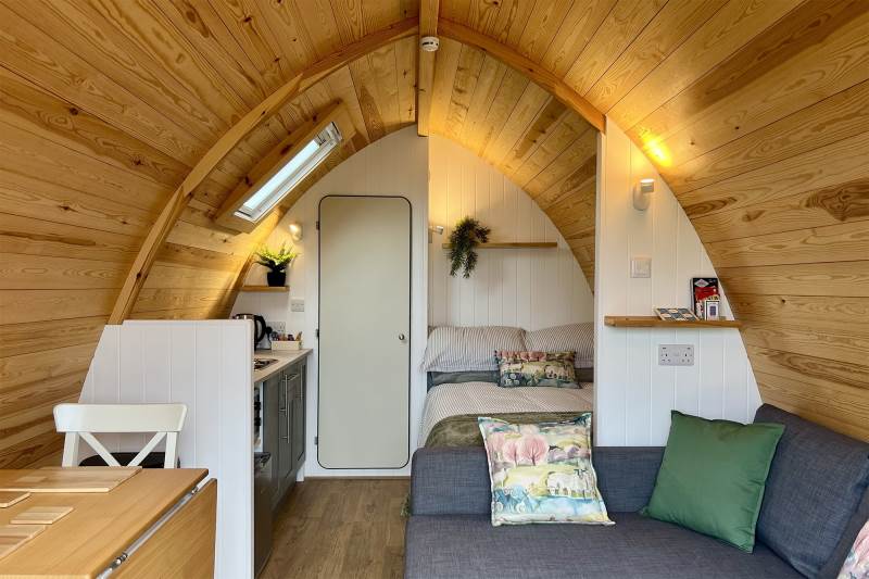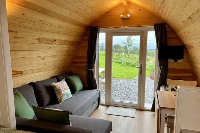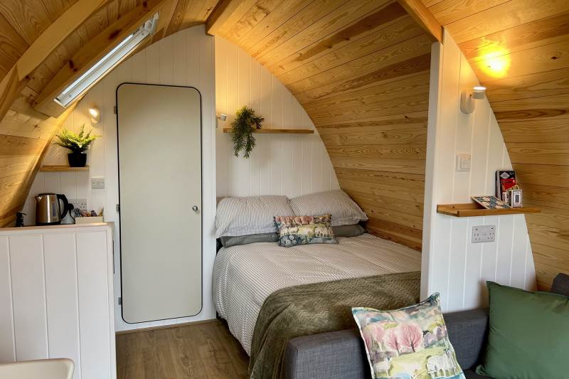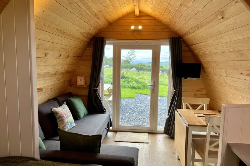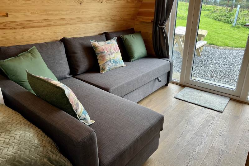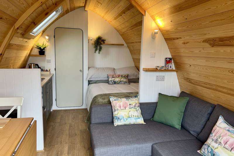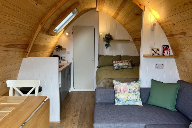 Ideal for a family getaway, the Whinfell Glamping Pod comfortably sleeps 2 adults and 2 children with a cosy double bed and a pull-out sofa bed. Insid