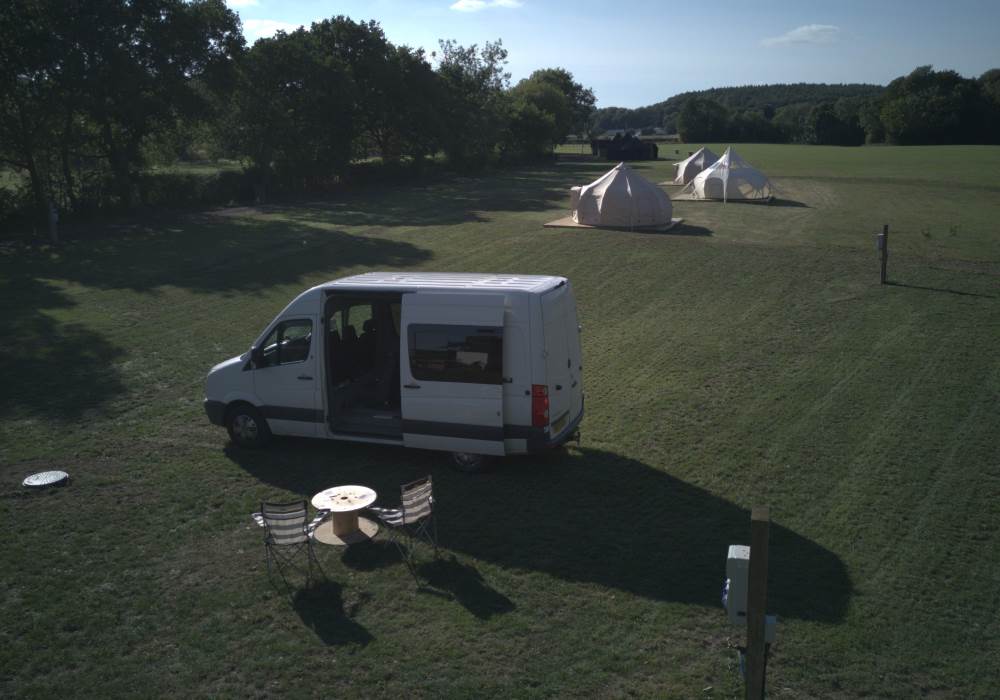 Our fully serviced grass touring pitches are thoughtfully designed for roof tents, campervans, motorhomes, and caravans. Each spacious 6m x 9m pitch offers generous room to relax, with well-spaced areas between pitches.