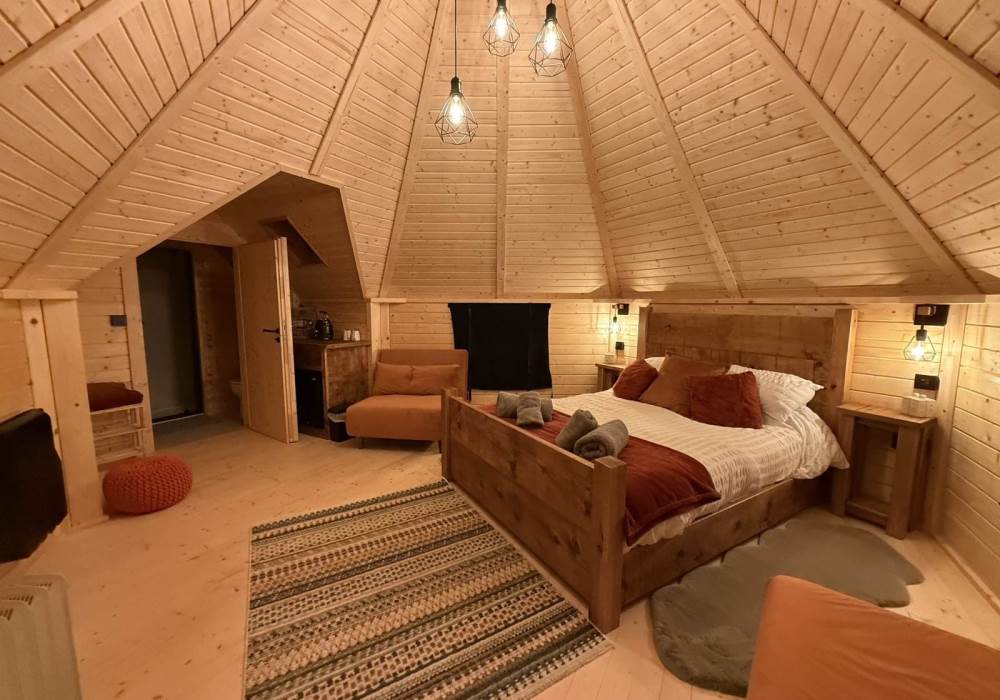 The Escape is a beautifully crafted, standalone glamping retreat set within open countryside, offering privacy, character, and a strong connection to nature. With its striking timber exterior, traditional pitched roof. Designed for guests who want something a little different, The Escape combines craftsmanship, comfort, and space making it ideal for couples seeking a peaceful escape or those looking to slow down and unwind in a natural setting.