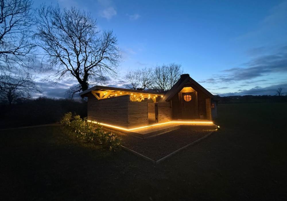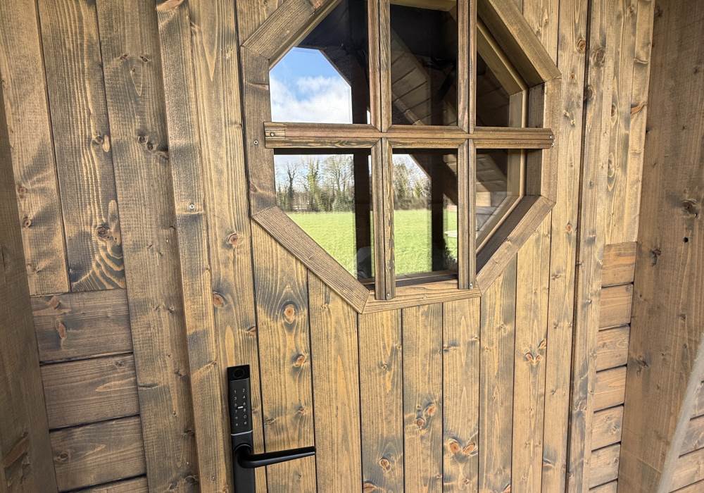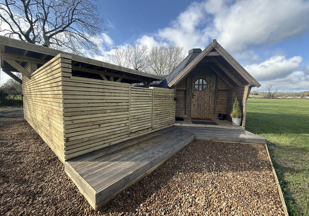 The Hideaway is a beautifully crafted, standalone glamping retreat set within open countryside, offering privacy, character, and a strong connection to nature. With its striking timber exterior, traditional pitched roof, and generous covered outdoor area, it feels both rustic and refined. Designed for guests who want something a little different, The Hideaway combines craftsmanship, comfort, and space—making it ideal for couples seeking a peaceful escape or those looking to slow down and unwind in a natural setting.