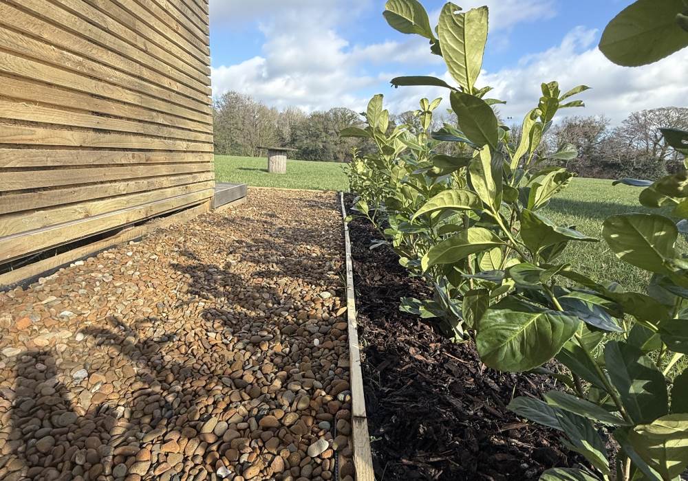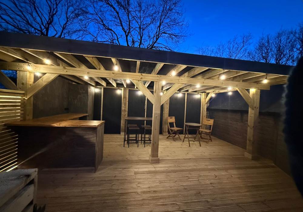 The decking flows seamlessly from the cabin entrance, offering plenty of room to relax, unwind, or enjoy a quiet drink outdoors. With open fields stretching beyond and mature trees framing the space, the setting feels peaceful and unspoilt—perfect for slow mornings, quiet afternoons, and cosy evenings surrounded by nature.