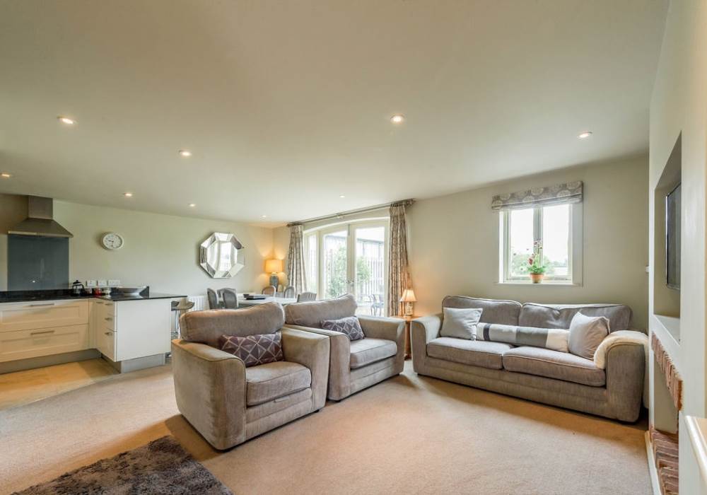 It is a charming open plan cottage consisting of a kitchen with breakfast bar /dining and lounge. There are 2 double bedrooms with King size beds and a single bedroom. bathroom with bath and shower. The sunny french windows open to stunning views across the fields, woods and into a private patio area.