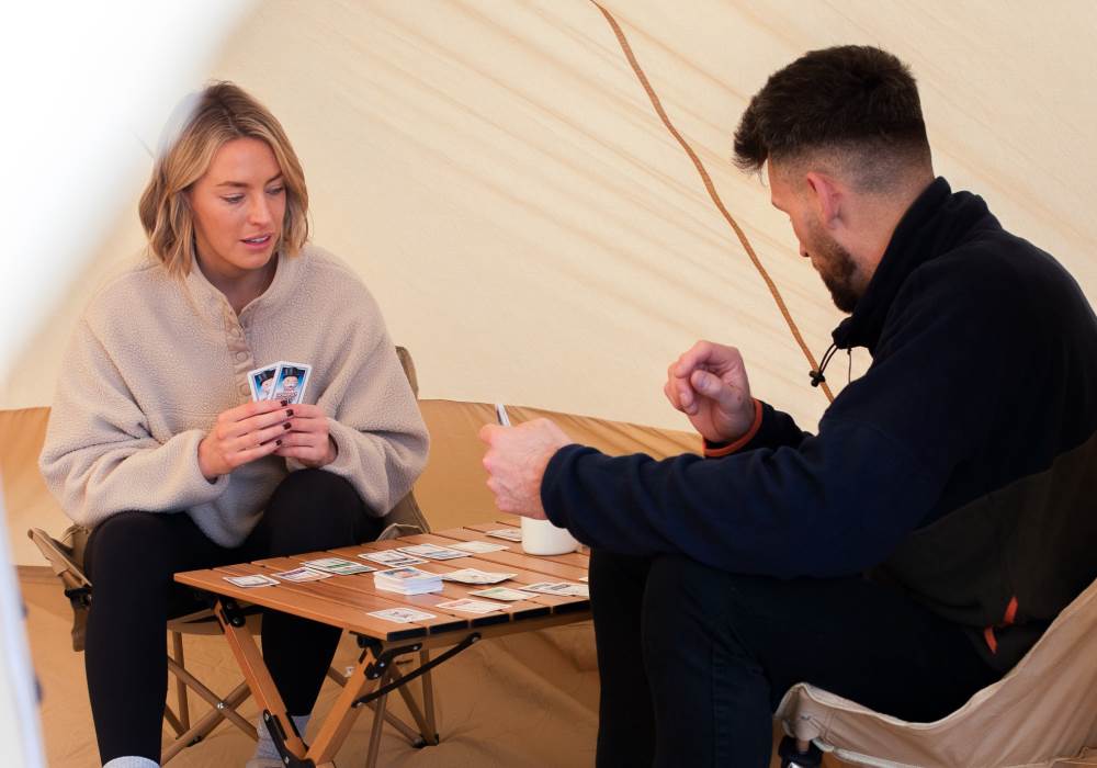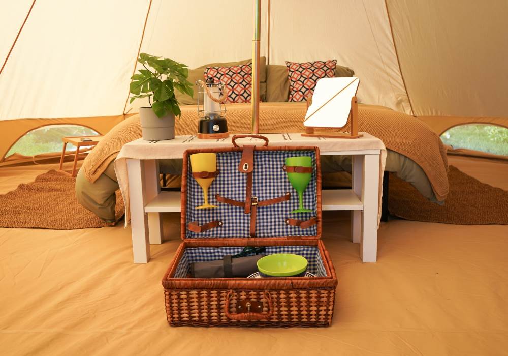 Starting with the star of the show: a full-sized double bed with a proper mattress (with all bedding and linen), this set-up also includes camping chairs and table; a picnic set; a kitchenette*; lighting; mirror; washing up basket and even games.