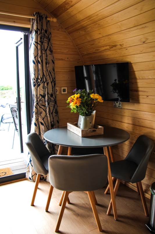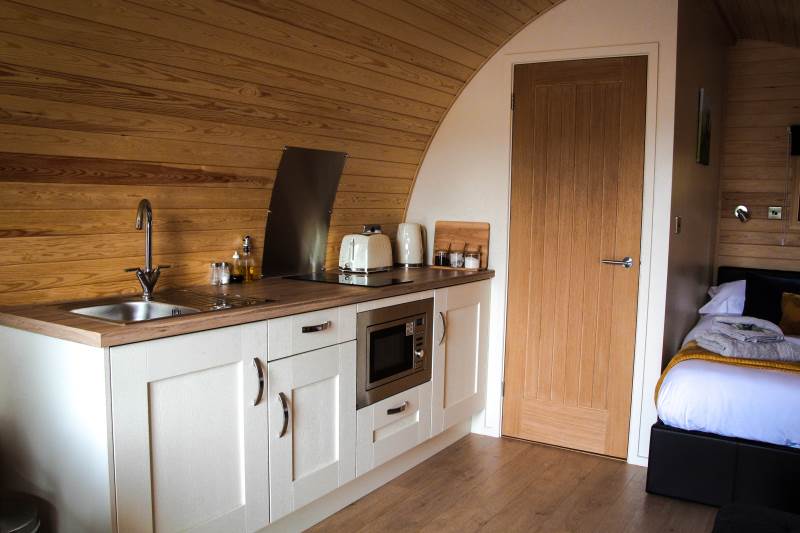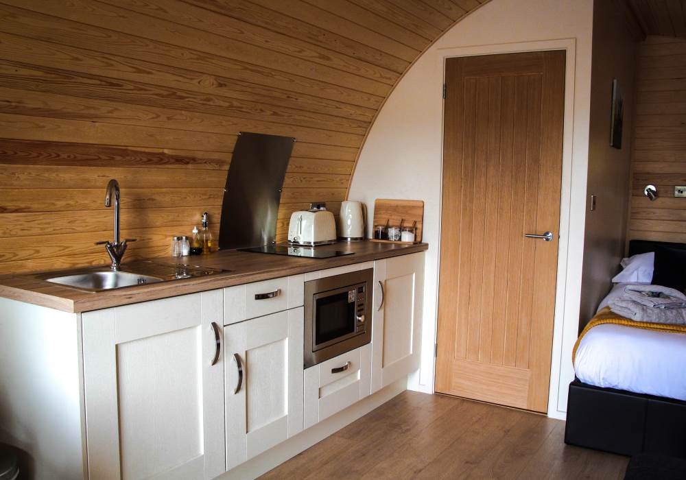 Perfect for a couples retreat or small family getaway, this Pod has a modern open-plan kitchen and living space complete with dining table for meal times and a Smart TV for relaxing in front of. The kitchen has been perfectly designed including a microwave and hob to rustle up a family meal. Get ready for the day in the compact bathroom with an electric shower, flushing WC and hand basin.