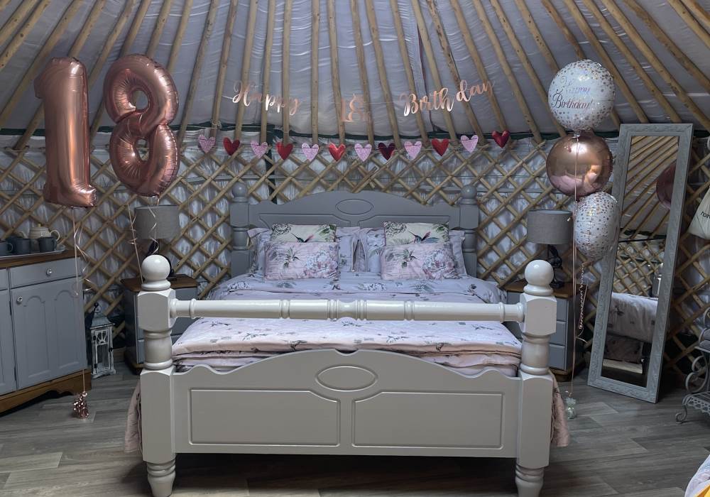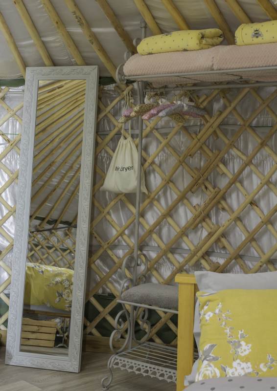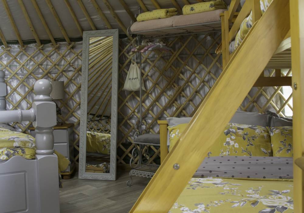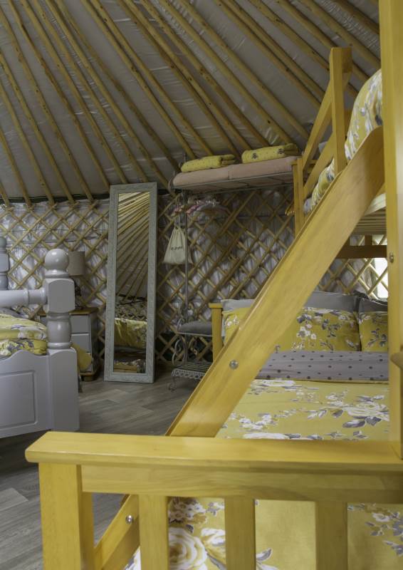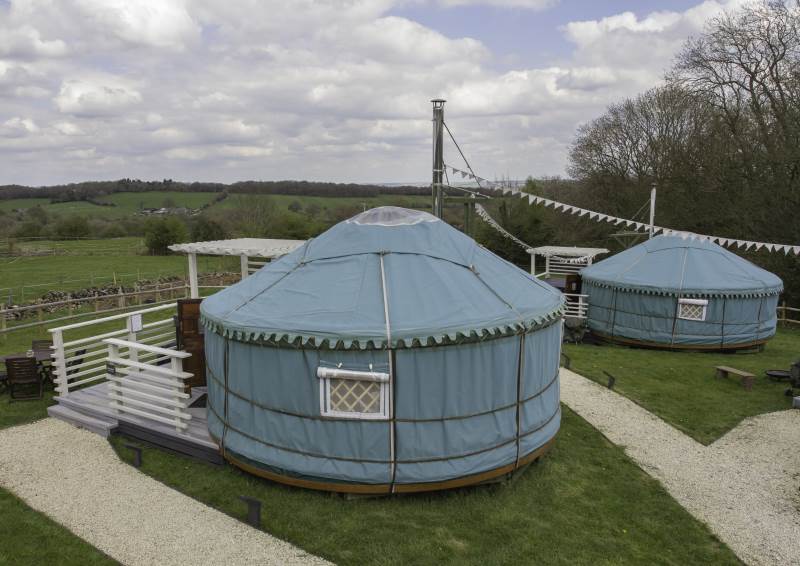 Set in the rolling hills of Derbyshire overlooking the Crooked Spire in the old market town of Chesterfield is Silver Birch. A large Mongolian yurt filled with all the comforts to give you a relaxing break. The yurt sleeps 5 people, with a king size bed and triple bunk with double and single beds. All bedding and towels are included. There is electricity in the yurt, just enough for bedside lamps, fairy lights and USB chargers.