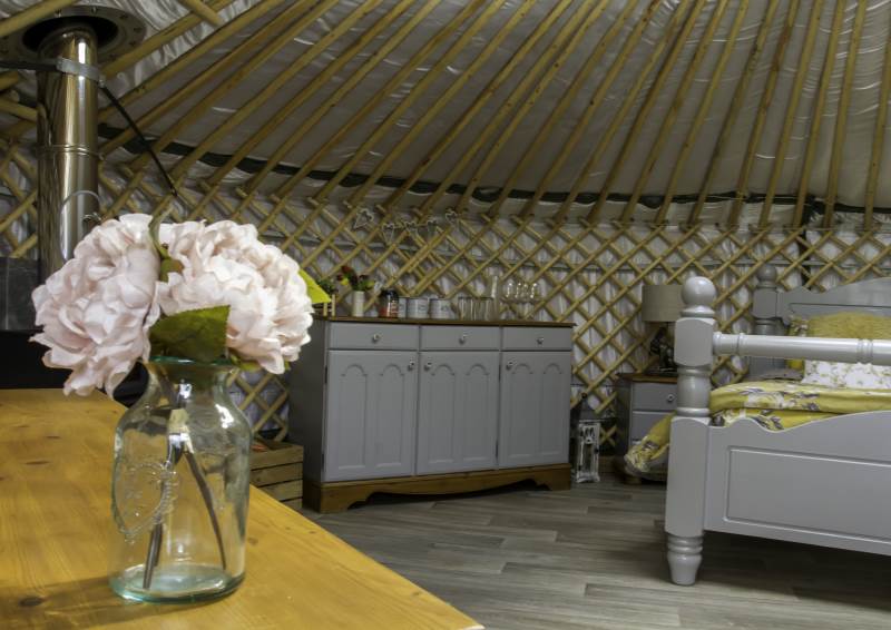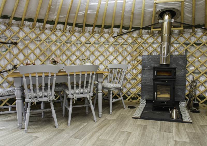 Inside you will find everything you need, all you need to bring on your holiday is your food and drink. Your yurt includes a dining table and chairs for enjoying meals around and playing games at night. A lovely log burner to keep you cosy, one crate of wood is provided when you arrive and the fire will be set ready for you to light when you're ready. You can purchase extra wood from us at £10.00 a crate or feel free to bring your own.