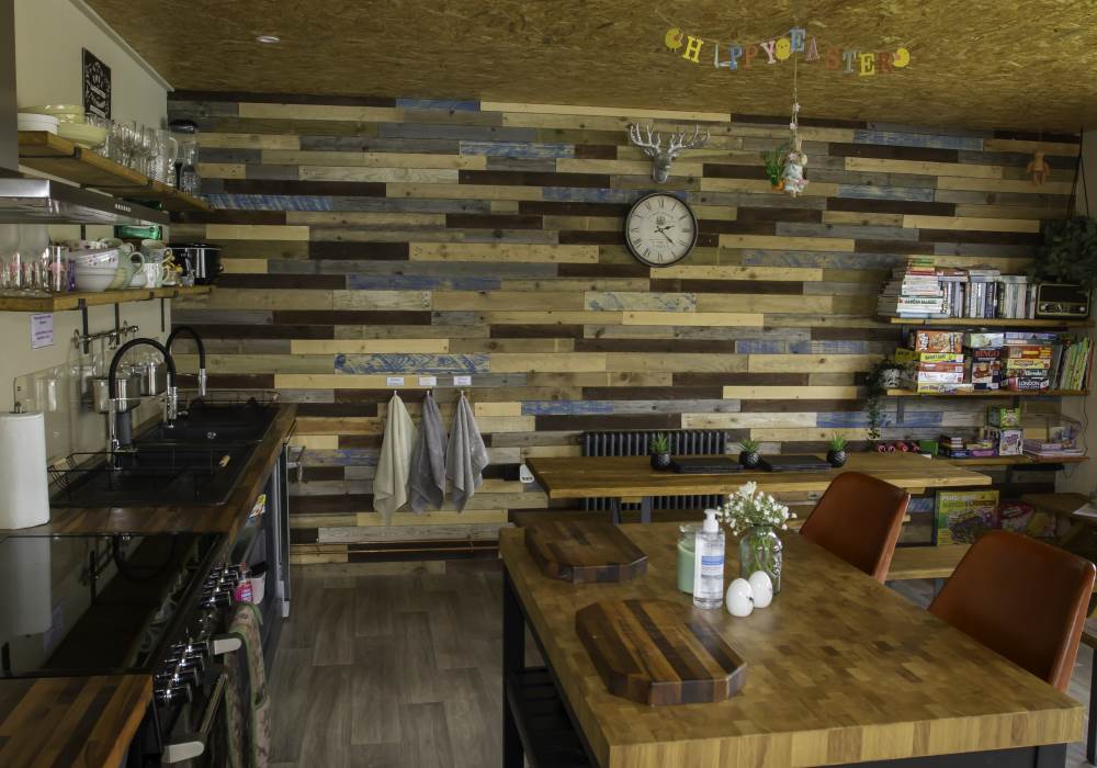 The large communal kitchen is well equipped with everything you could need to cook a Sunday roast or bake with kids on a rainy day. There's plenty of seating for everyone to get together. Book's and games for all ages are in there, and a bluetooth radio to enjoy some music while relaxing. Large patio doors lead to a balcony which over looks the fabulous views, a great place to enjoy your morning coffee.