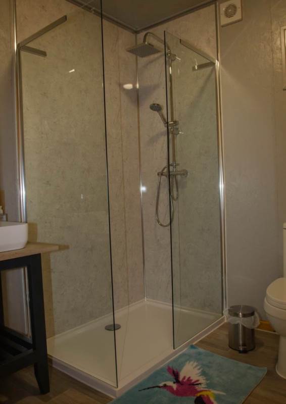 Just a few second's walk away is the kitchen and bathroom block. You will have a private bathroom solely for your use, here you will find a double shower with rainfall shower head, wash basin, flushing toilet and heated towel radiator. Toilet roll, hand wash and sanitiser are all ready for your use.