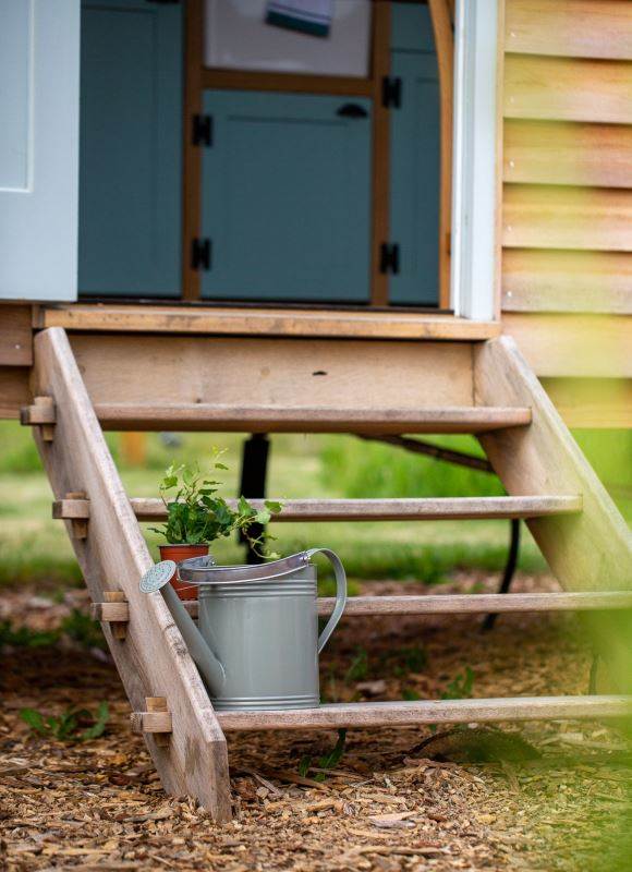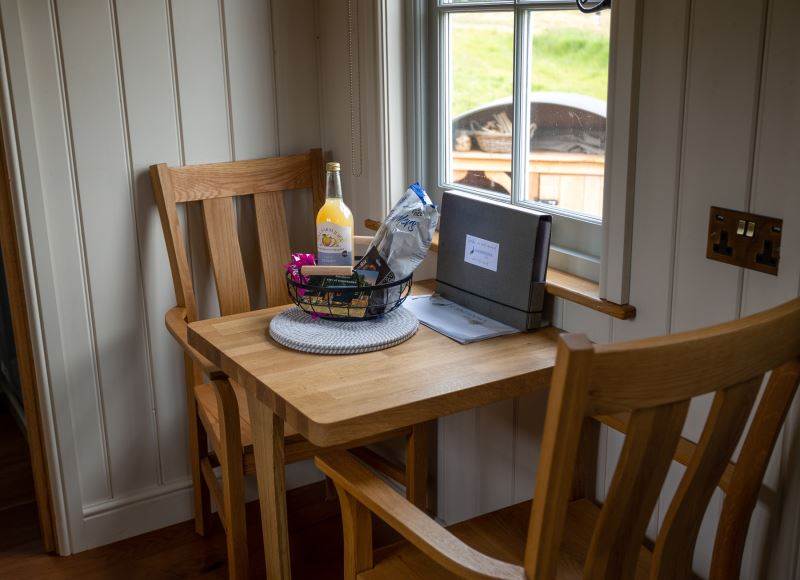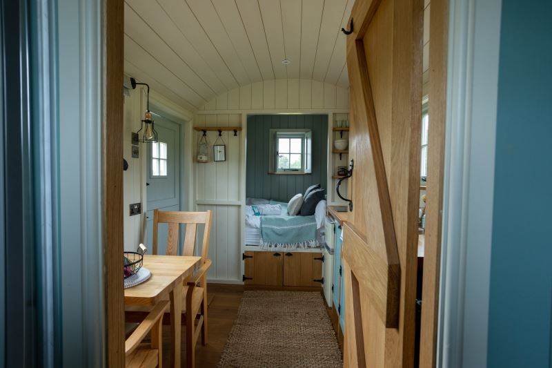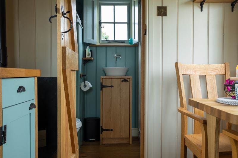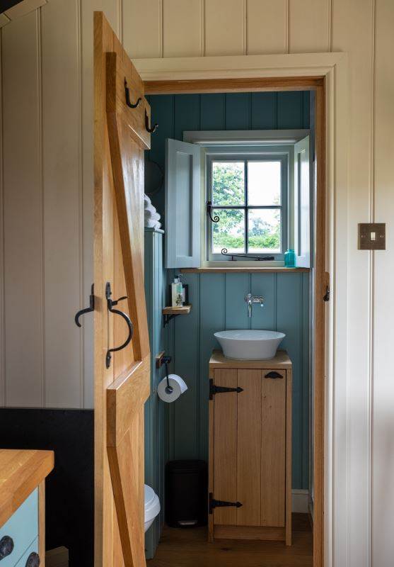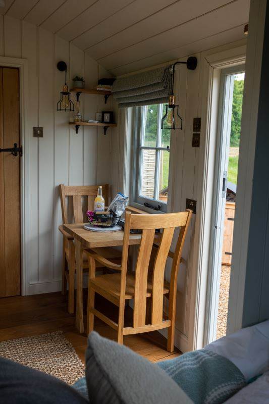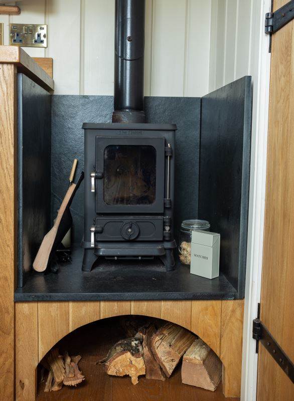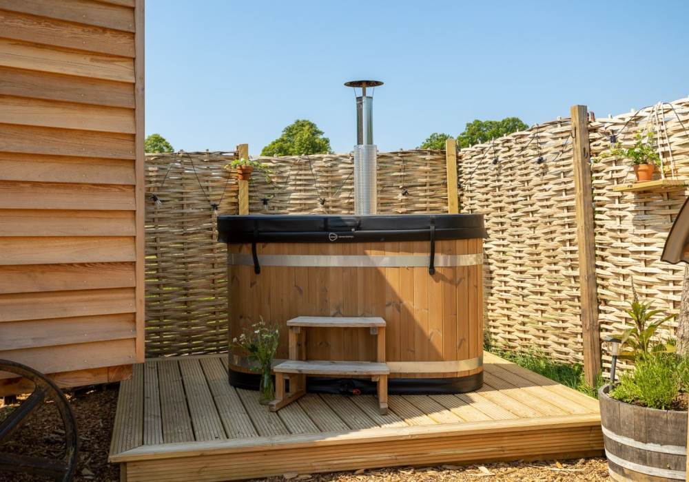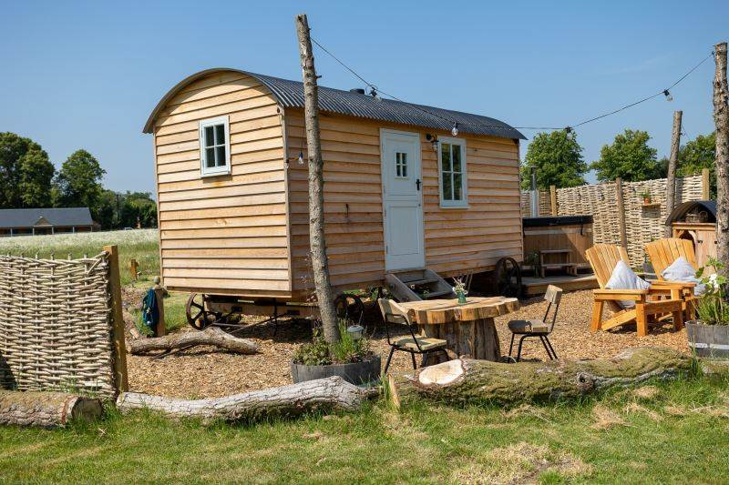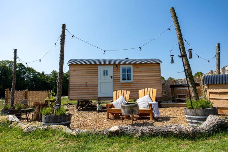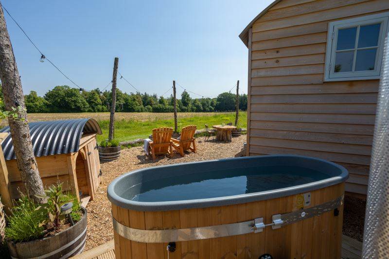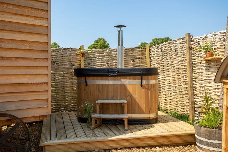 A beautiful, locally crafted shepherd's hut with a full-size double bed, organic cotton bedding, ensuite full-size hot water shower and toilet. Mini kitchen area with fridge freezer, 2 ring induction hob, kettle and toaster. Outside you’ll be surrounded by the estate’s wildlife, outdoor furniture that’s been lovingly created from wood from the estate, locally sourced charcoal for the Weber bbq, re-purposed washing machine drum firepit, and the highlight is the wood-fired hot tub.