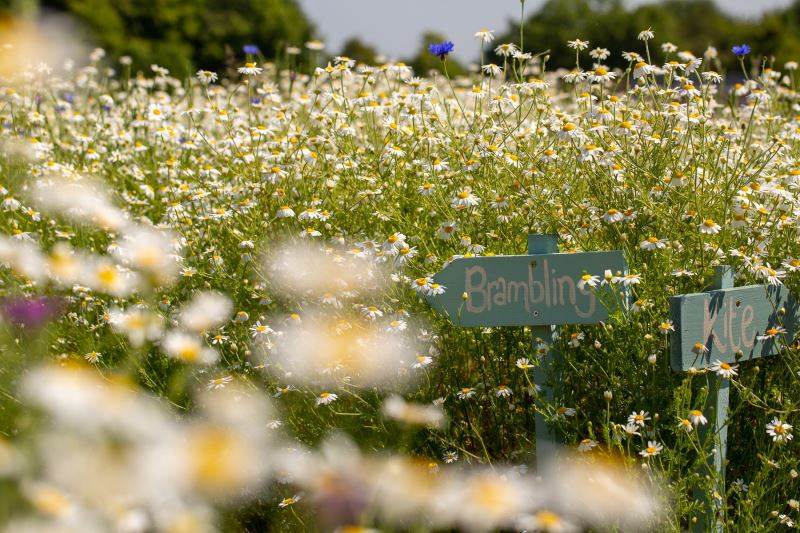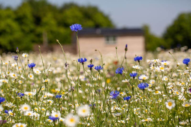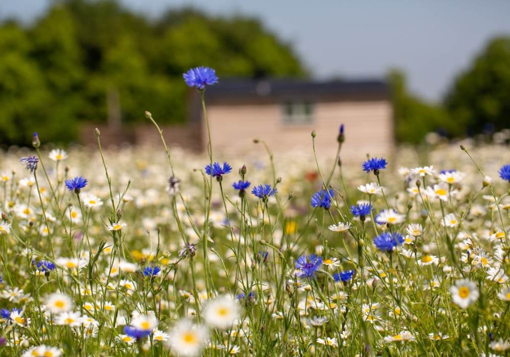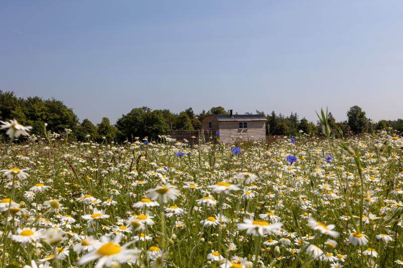 The wildflower meadow behind the huts is sown exclusively to feed the wild birds that migrate to the estate for the winter months. In return they treat us with their stunning