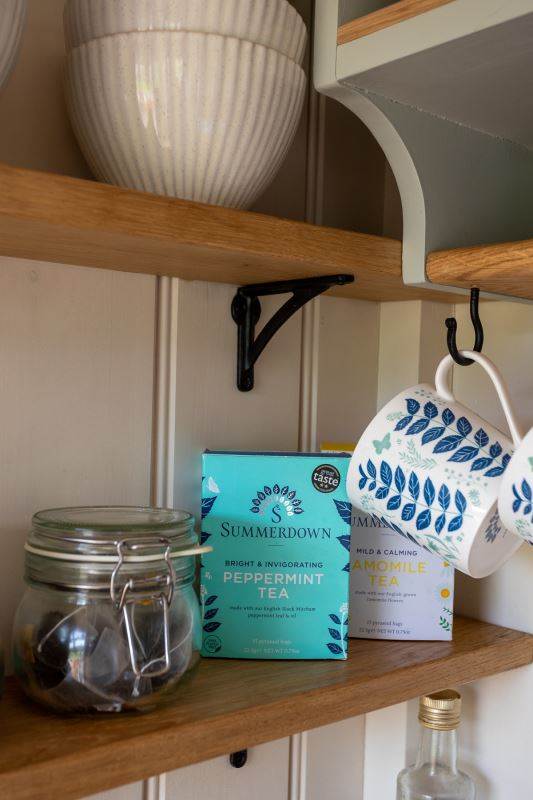 Brew Tea Bags, Moon Roast Coffee, Fairtrade sugar, Summerdown Peppermint tea and Camomile tea. Chocolate digestive biscuits and marshmallows. Salt flakes, coarse ground pepper, locally produced oil.