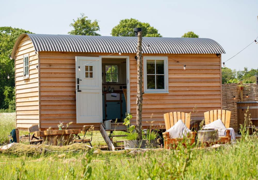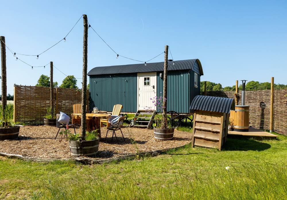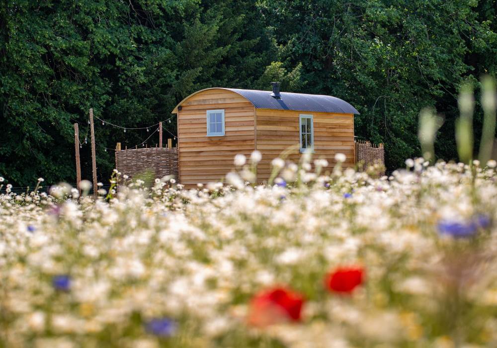 Escape to your own private Stay at Summerdown, where a spacious two-storey pavilion and four beautifully crafted shepherd’s huts (each with its own hot tub and firepit) are nestled in a wildflower meadow and reserved exclusively to accommodate up to 12 adults. Your own private corner of Hampshire countryside with direct access to woodland walks, starlit nights and cosy indoor dining this is the ultimate setting for celebrations, retreats, family gatherings, or slow weekends in nature. For more information or to pre-reserve your dates, contact us on stay@summerdown.com.