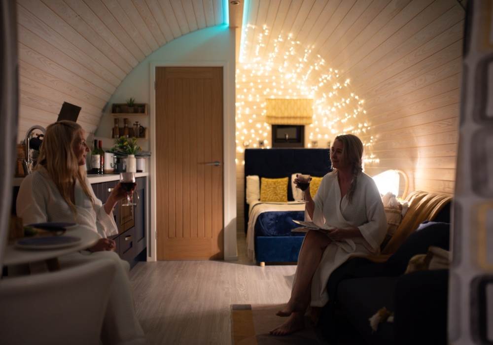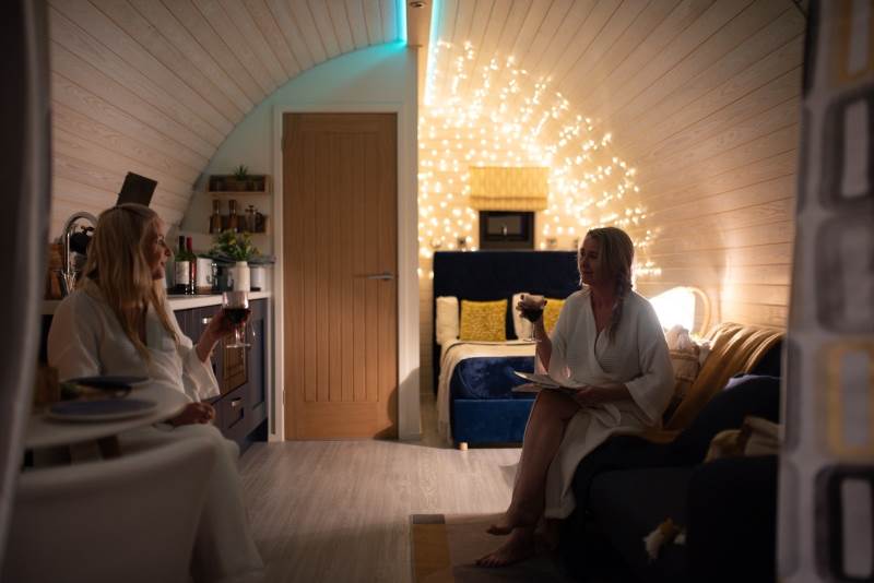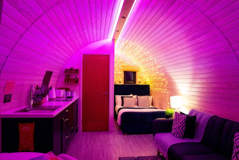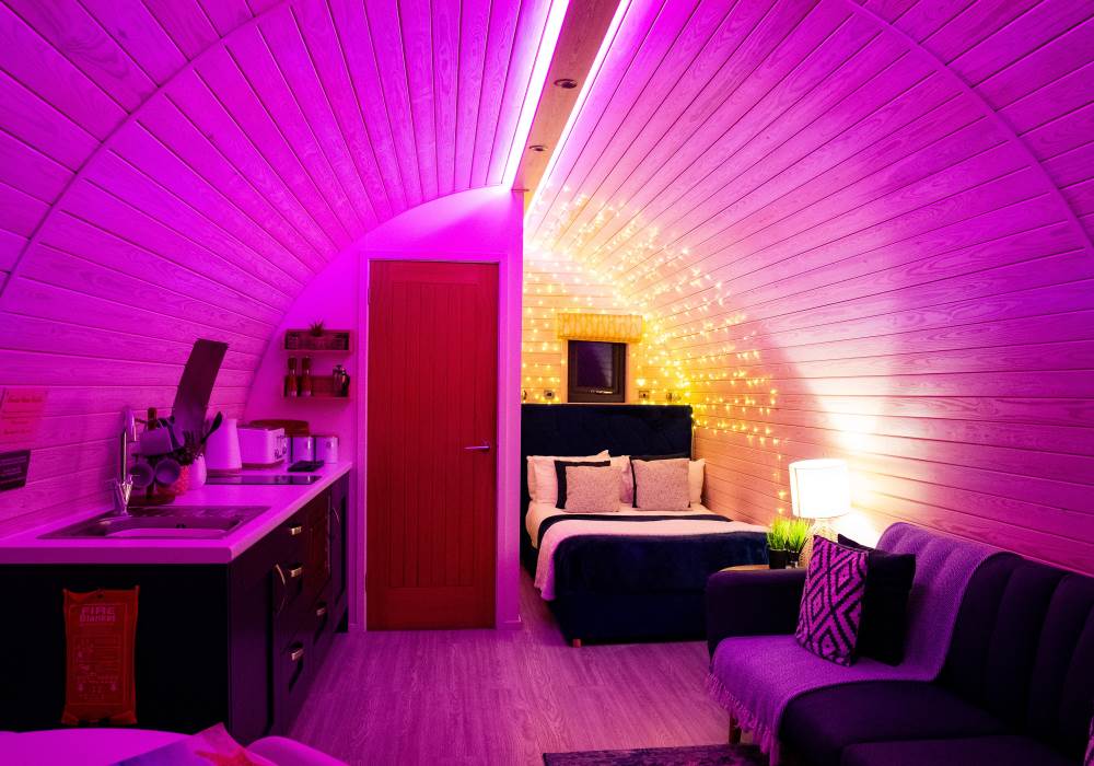 Our brand new, stunning VIP Pod offers everything you need for a luxurious stay. Inside, you'll find a fully equipped kitchen with a two-ring hob, built-in microwave, fridge, and TV. The double bed comes with high-quality linen, and there's a sofa bed in the lounge area for added convenience. Central heating keeps you comfortable throughout, and the ensuite features a toilet, shower, and fluffy towels, along with dressing gowns provided for your comfort.