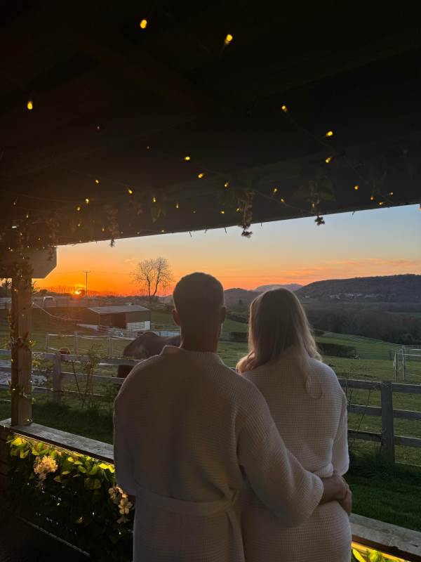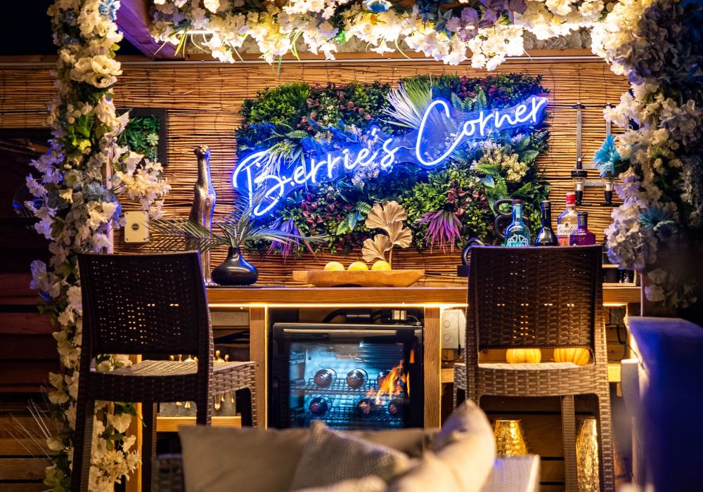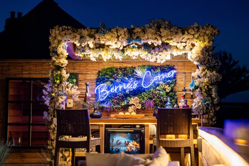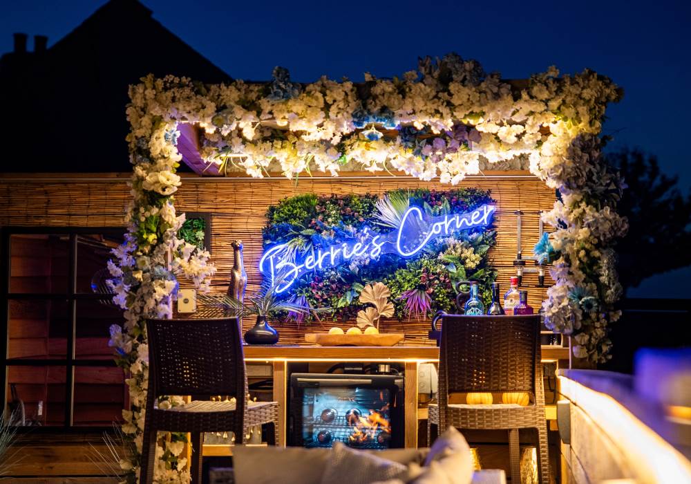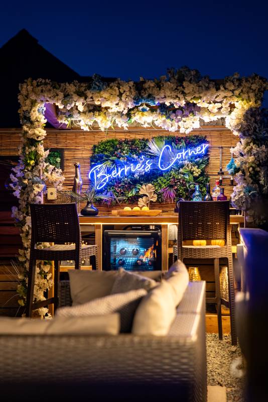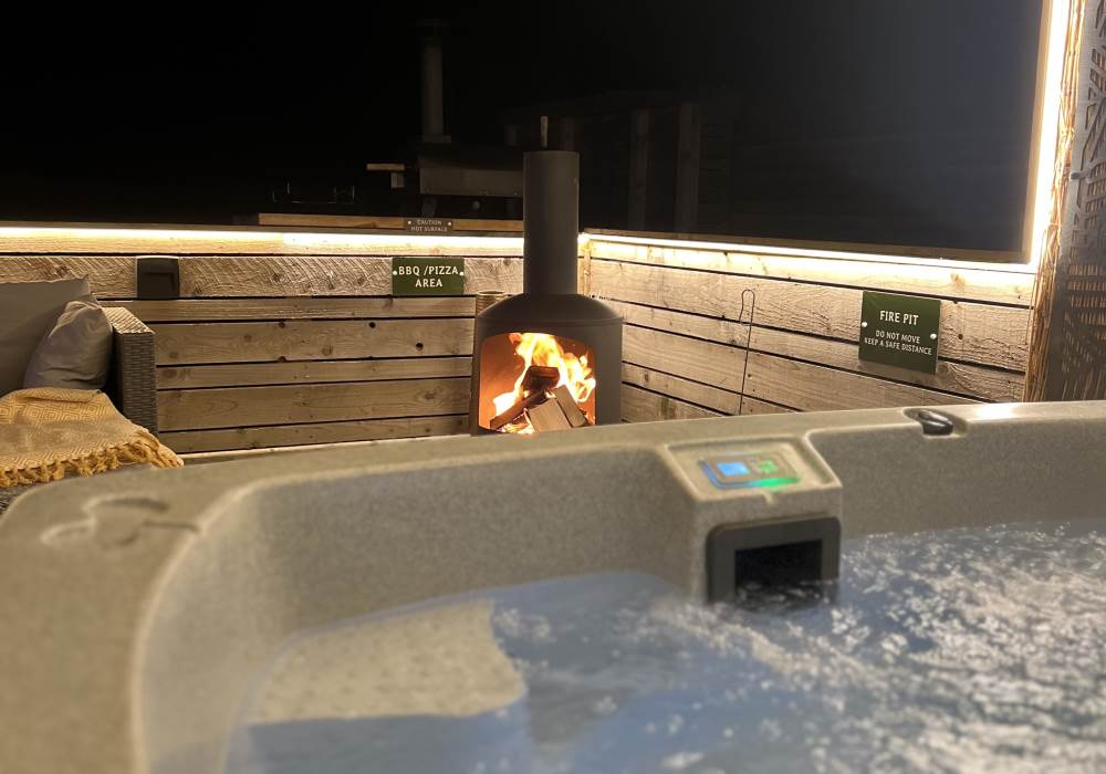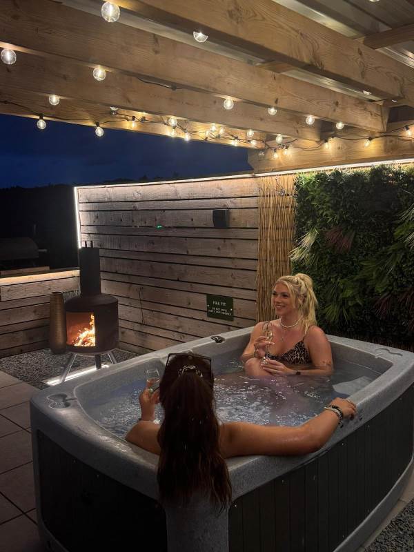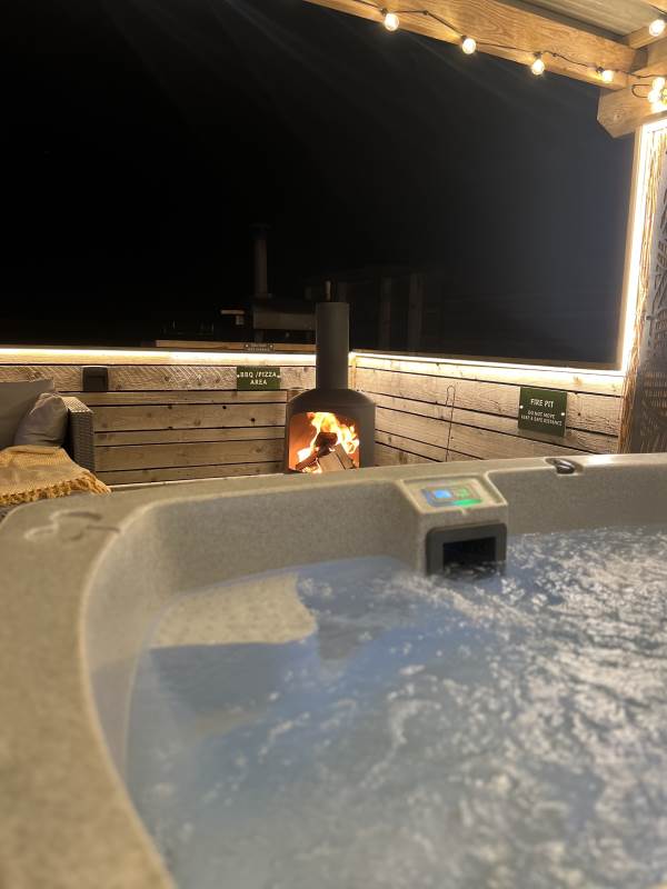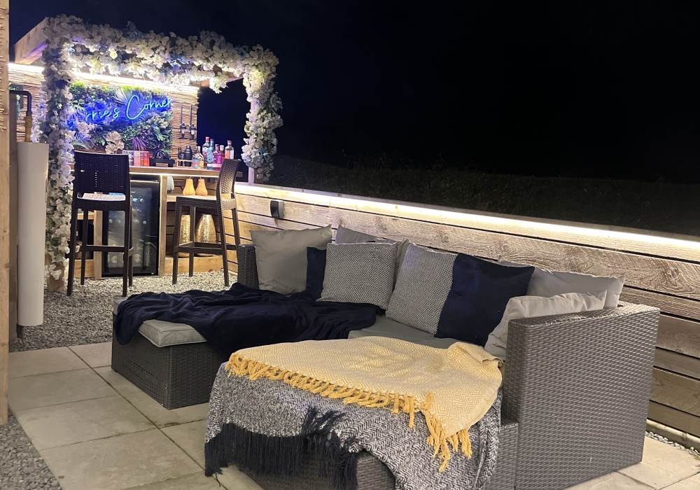 Step outside to enjoy the brand-new bar area with bar stools, mood lighting, and vibrant neon lights. The hot tub, sheltered under a pergola, is surrounded by flower walls twinkling with fairy lights, creating a magical atmosphere. Relax on the large rattan sofa, gather around the fire pit, or cook up a meal in the pizza oven while enjoying the breathtaking views. An additional seating area with a dining table and chairs is perfect for watching the evening sunsets. We also provide tea, coffee, and sugar to make your stay even more enjoyable.