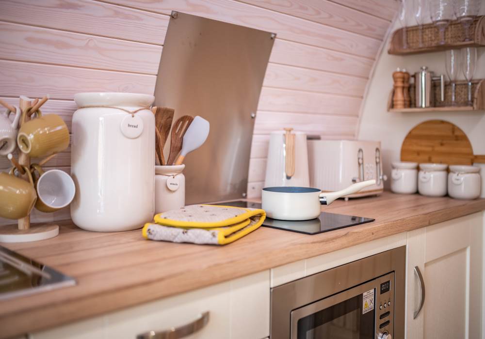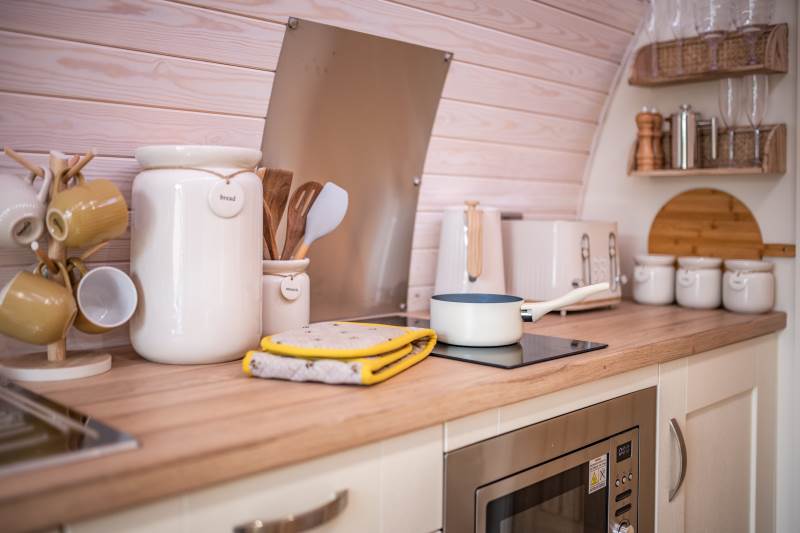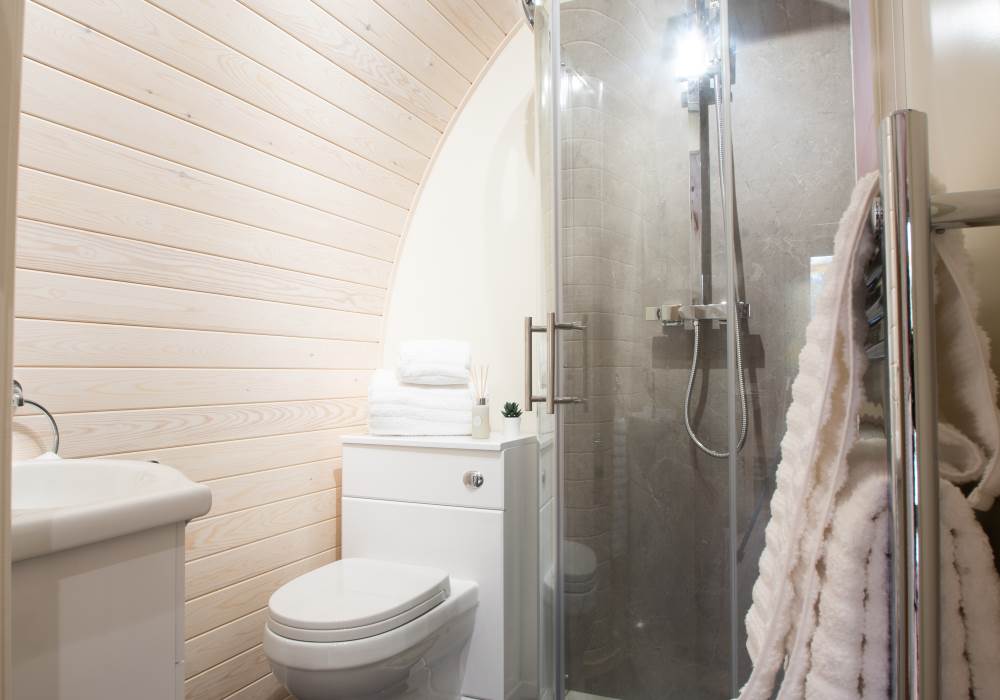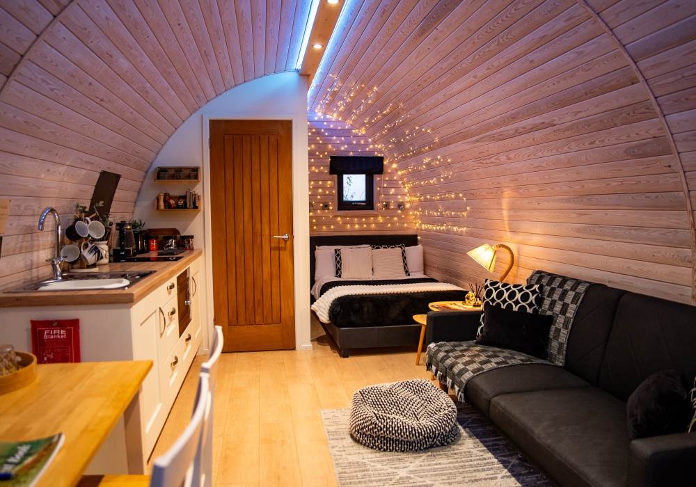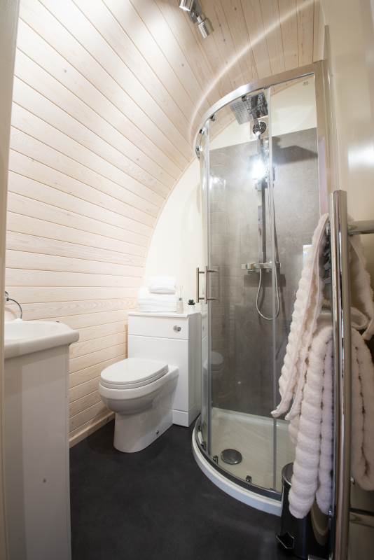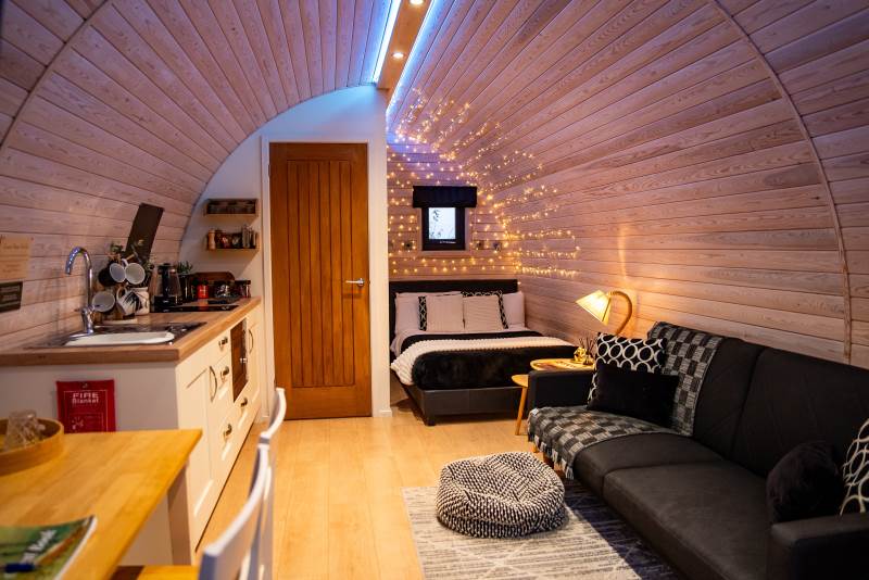Inside, your pod is equipped with a fully functional kitchen that includes a two-ring hob, built-in microwave, fridge, and TV. A double bed with fresh bedding and linen ensures a restful night, and the lounge area includes a cozy sofa. Central heating keeps things comfortable all year round, and the dining table provides a lovely spot for meals. The ensuite bathroom includes a toilet, shower, fluffy towels, and waffle robes. Plus, we supply a kettle, toaster, coffee, tea, sugar, and a jar of shortbread for your enjoyment!