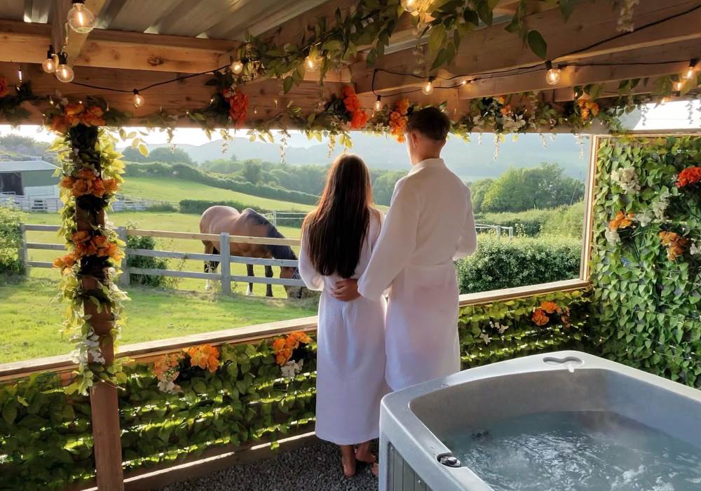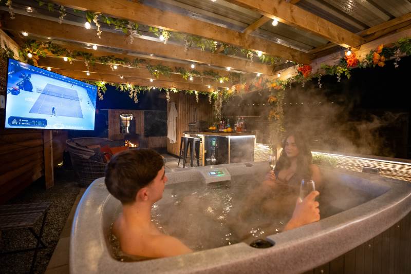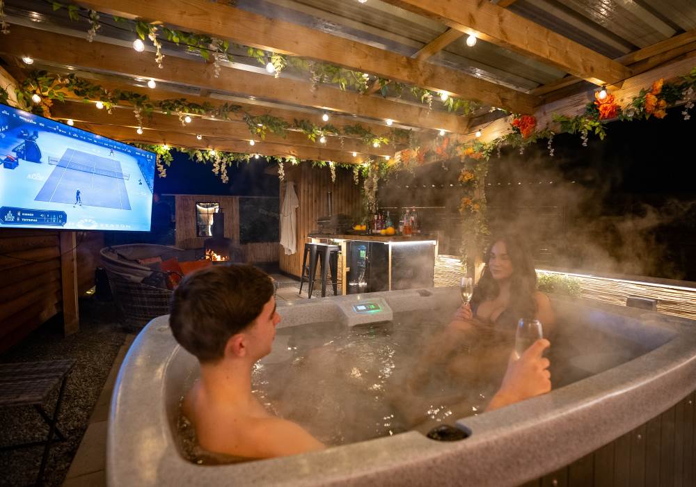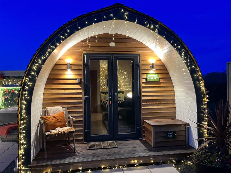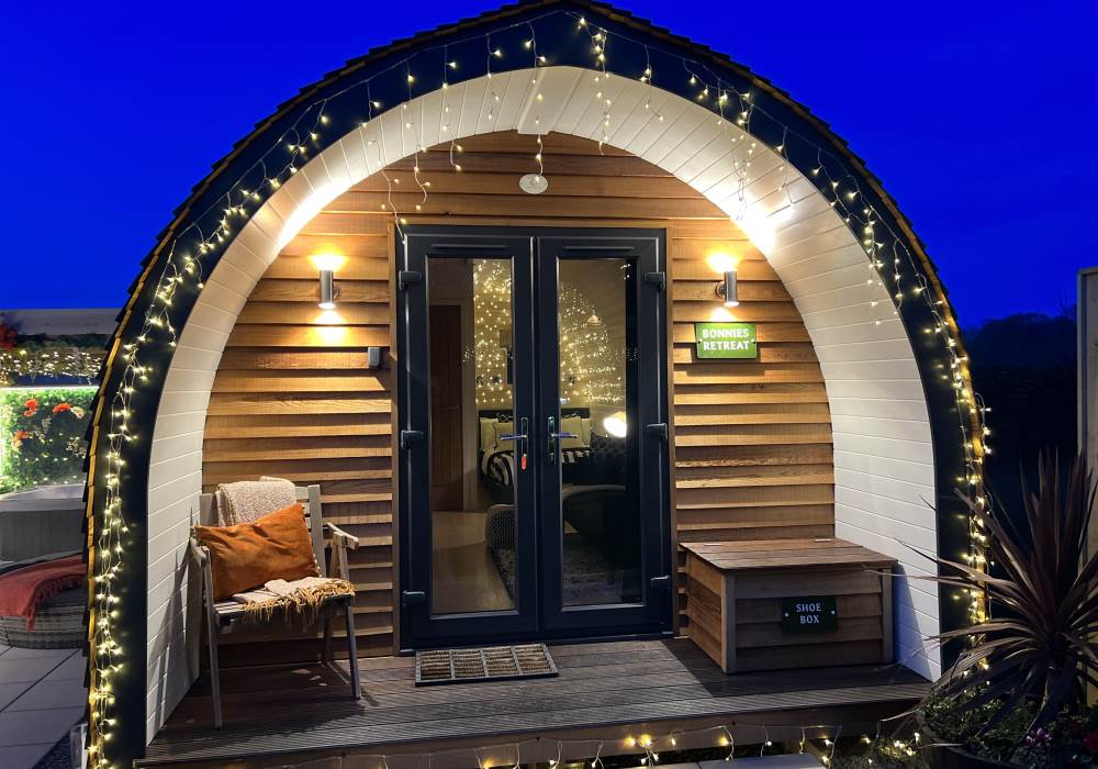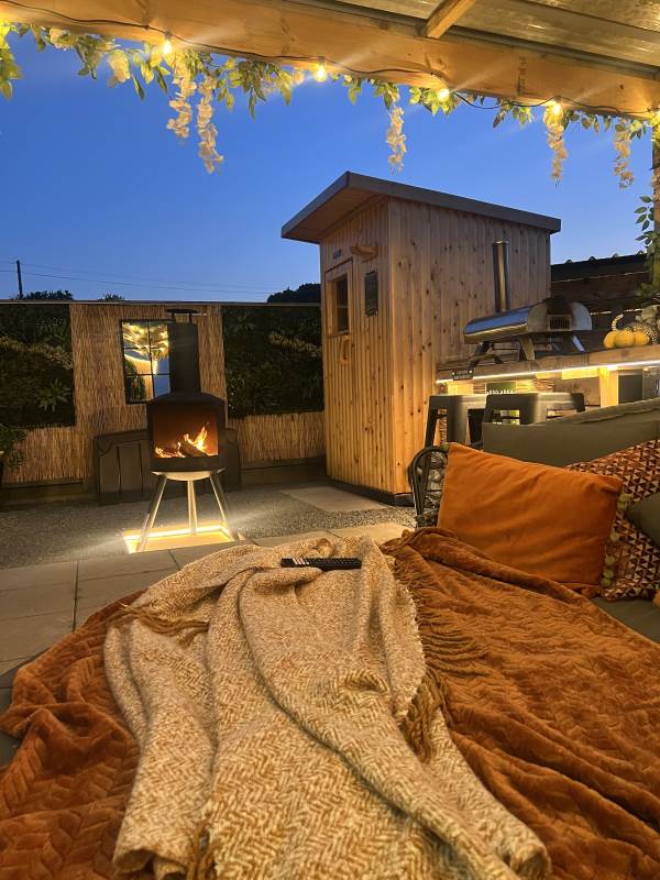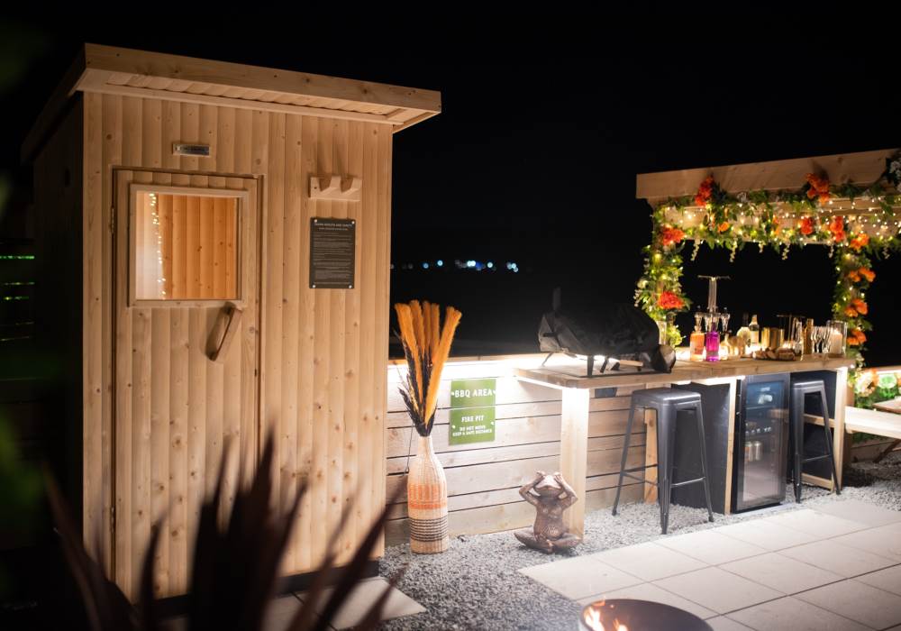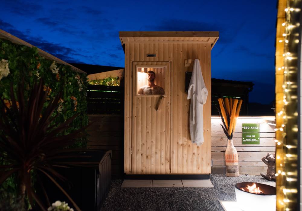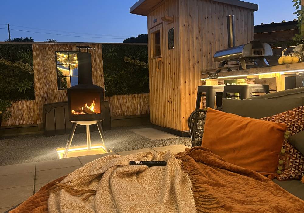 Our Super VIP Pod offers the ultimate getaway, featuring a private hot tub with stunning views and amazing vibe lighting. Enjoy your favorite films on the 50" outdoor SMART TV, keep drinks chilled in the outdoor fridge, and relax on the large outdoor sofa with fluffy blankets. The fire pit and pizza oven add a touch of luxury to your outdoor experience. For the ultimate relaxation, indulge in the outdoor infrared sauna, completing your stay at Tan Y Bryn Glamping.