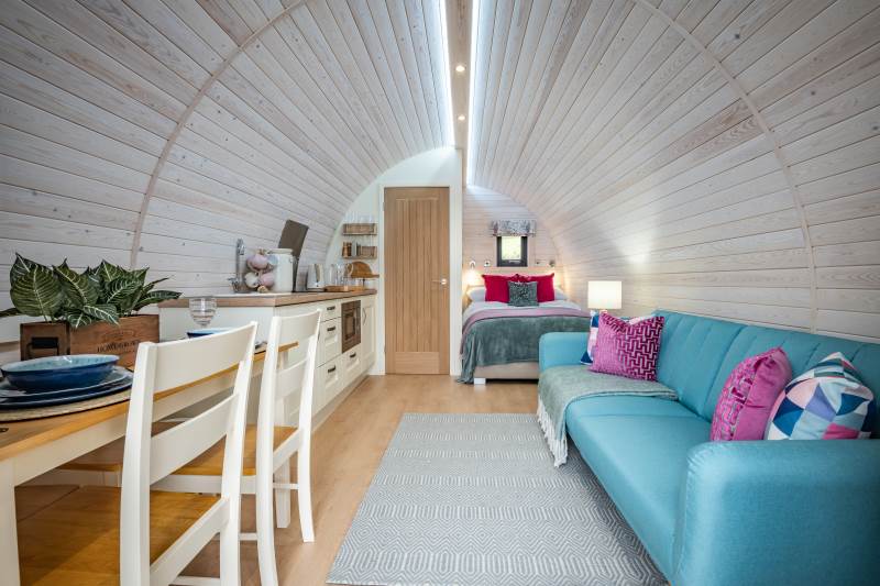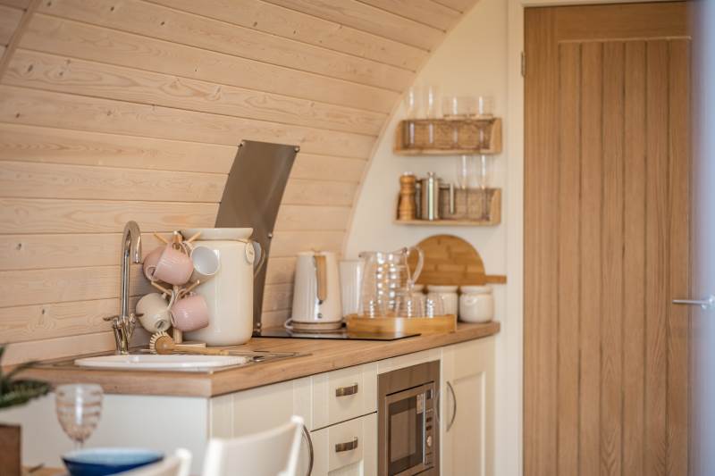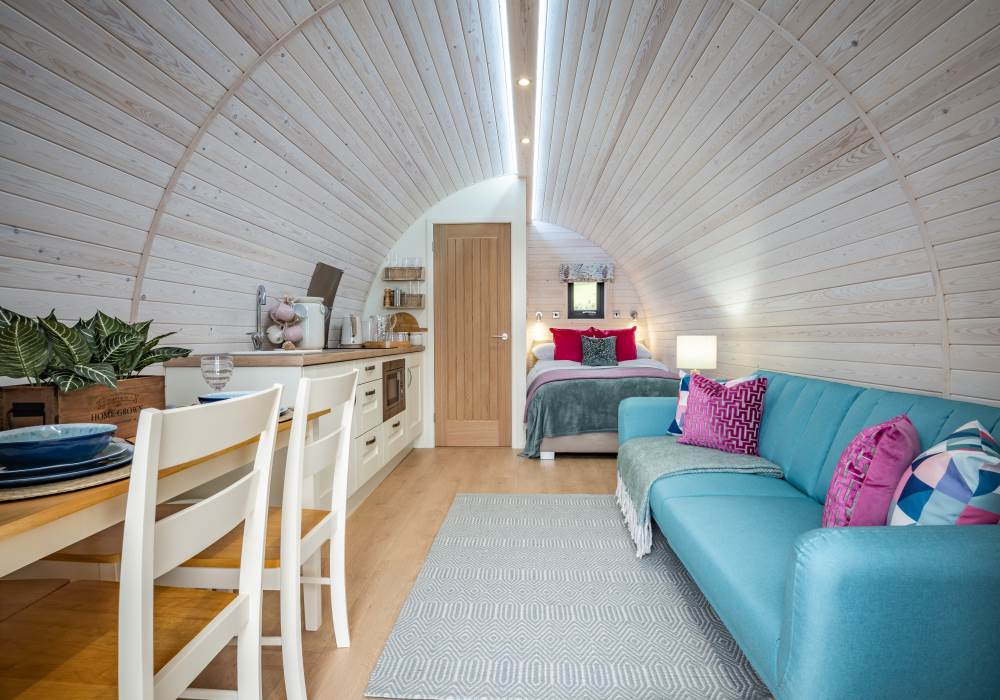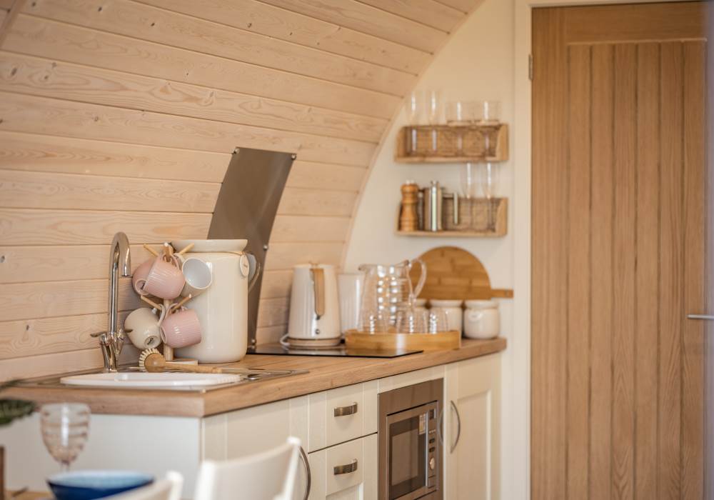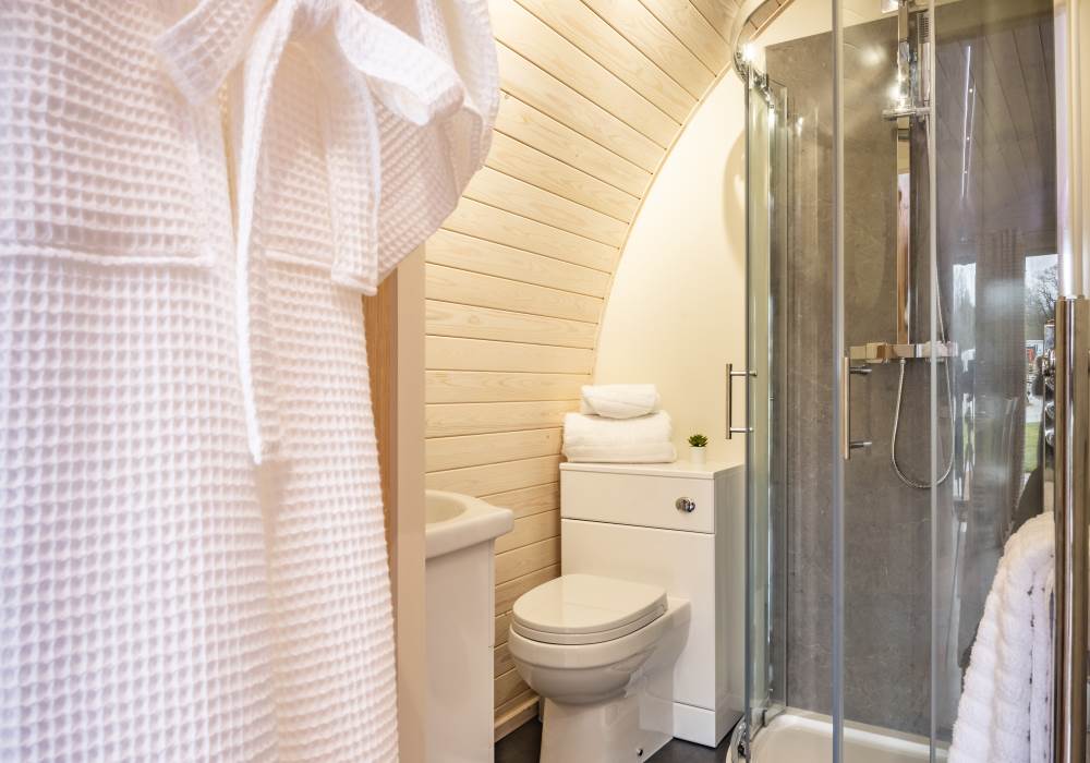 Inside, the pod features a fully equipped kitchen with a two-ring hob, built-in microwave, fridge, and TV. A double bed with luxurious linens ensures a restful sleep, and there’s a sofa in the lounge area for extra comfort. Central heating keeps the pod warm year-round, and the ensuite bathroom includes a toilet, shower, fluffy towels, and dressing gowns. We also provide a kettle, toaster, coffee, tea, sugar, and biscuits for your enjoyment.