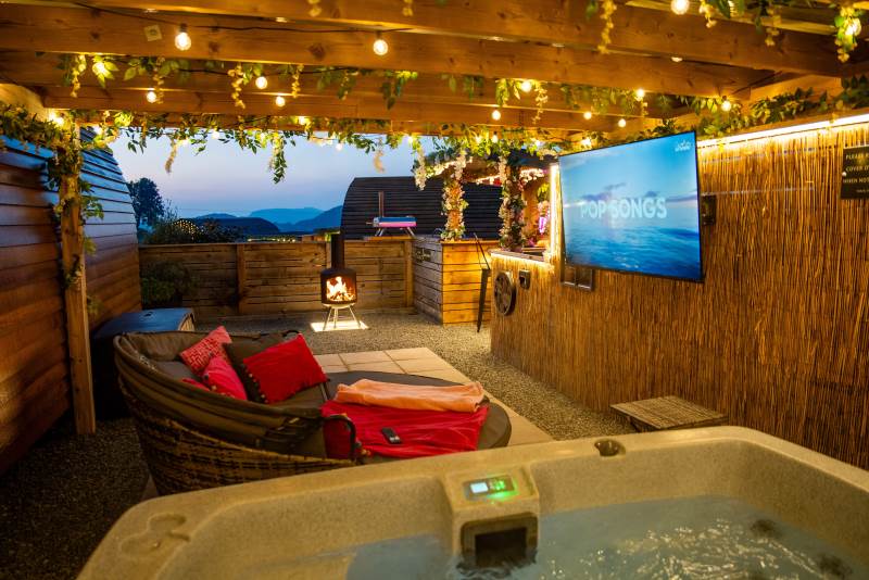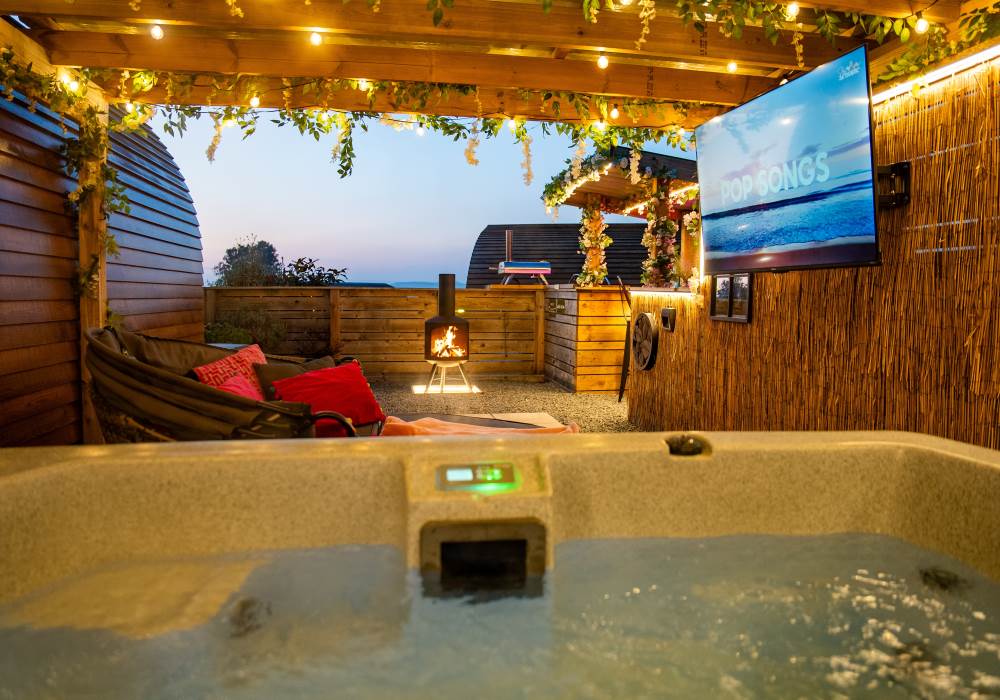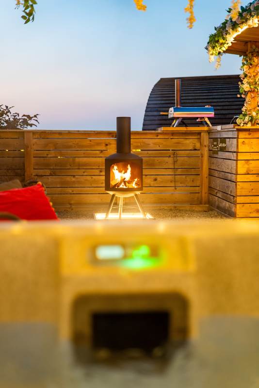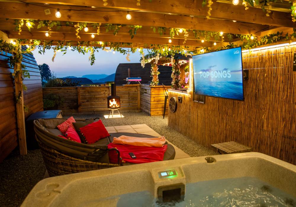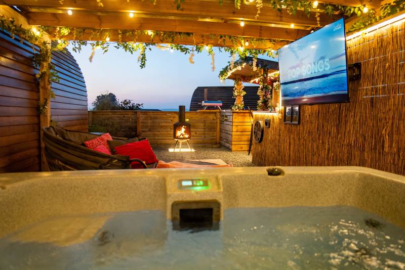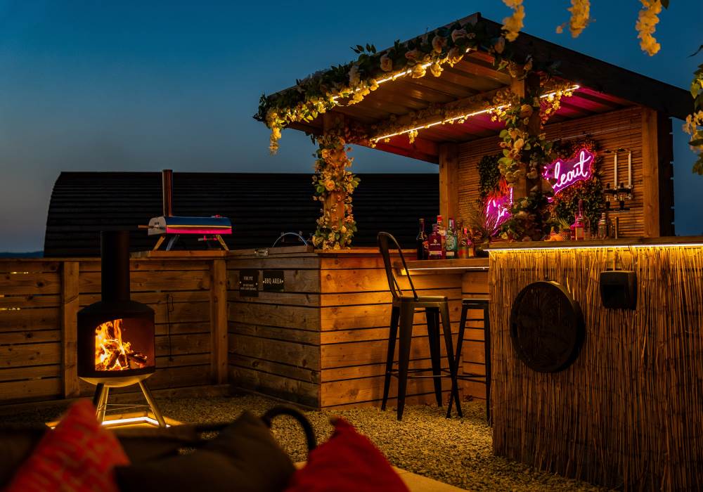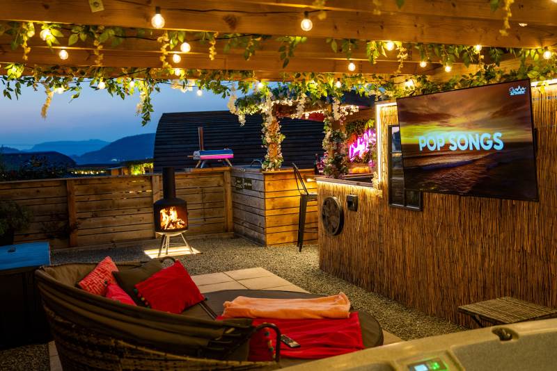 Cindy's Hideout is one of our exquisite VIP pods, offering a private terrace complete with a new, stylish bar area, vibe lighting, and an outdoor smart TV. Unwind in the hot tub beneath a pergola adorned with fairy lights, or enjoy the BBQ area, fire pit, and comfy sofa with cozy throws and cushions. It’s the perfect spot to relax and watch the sunset.