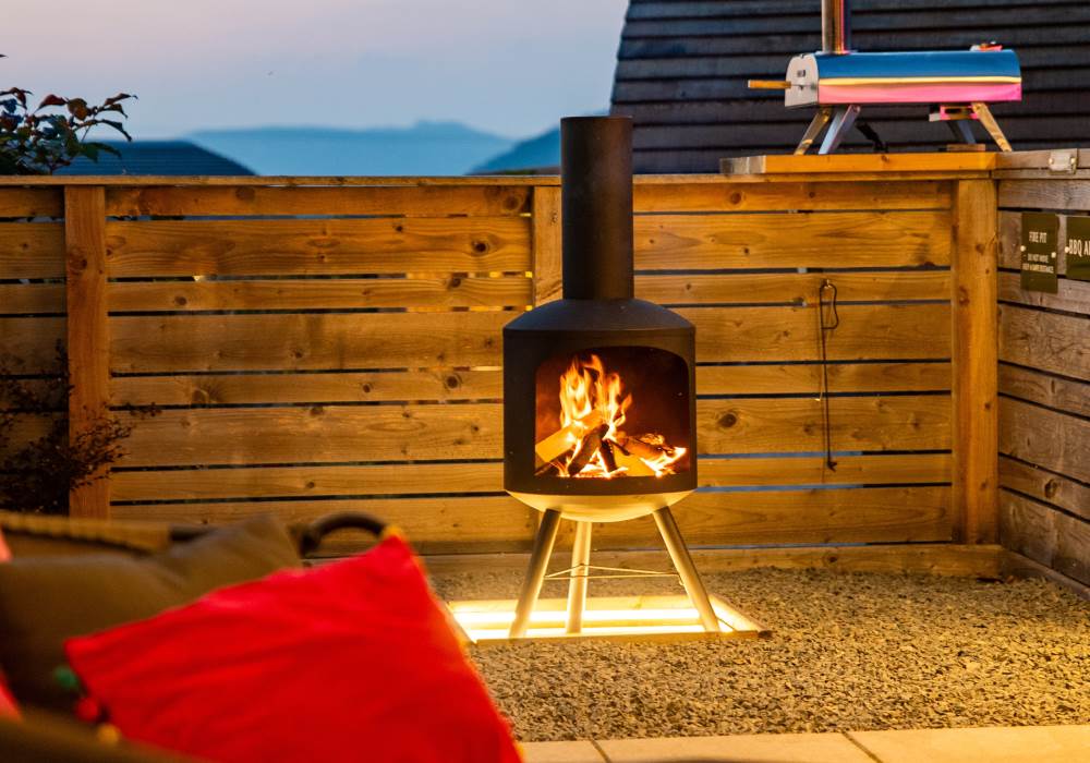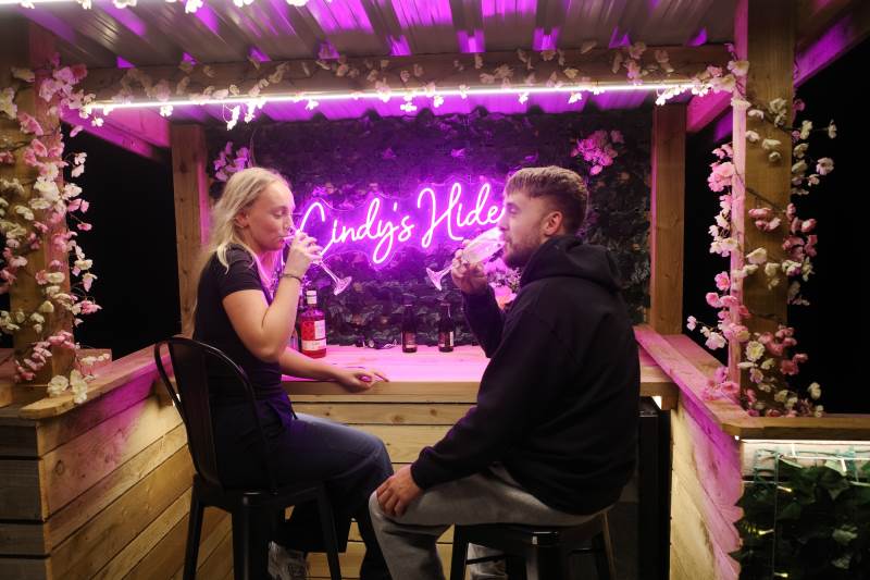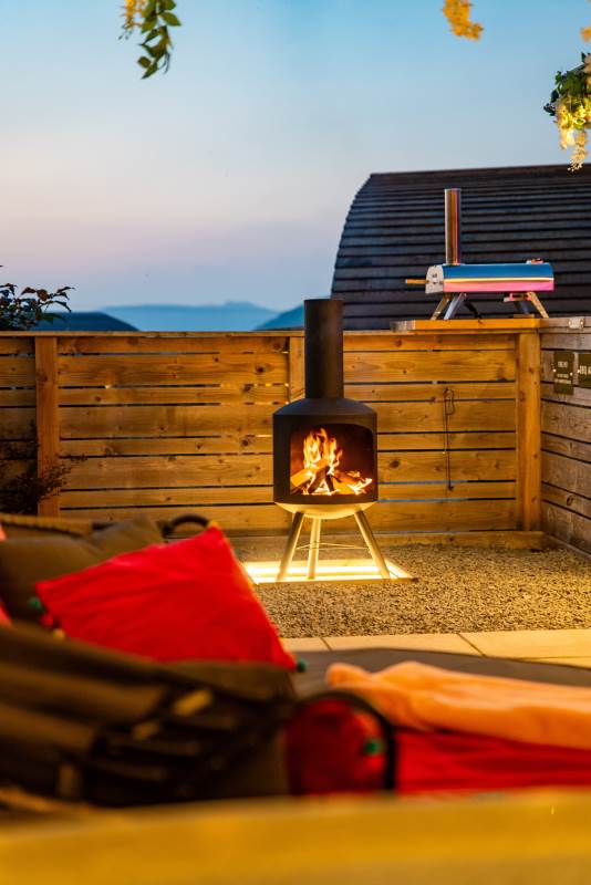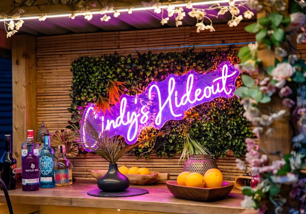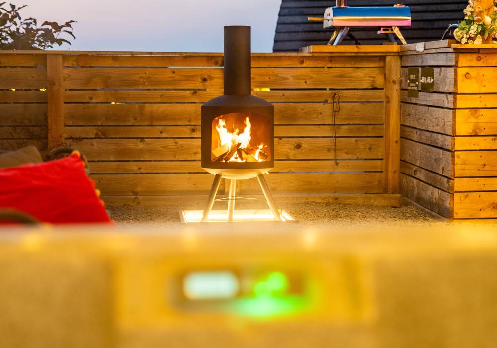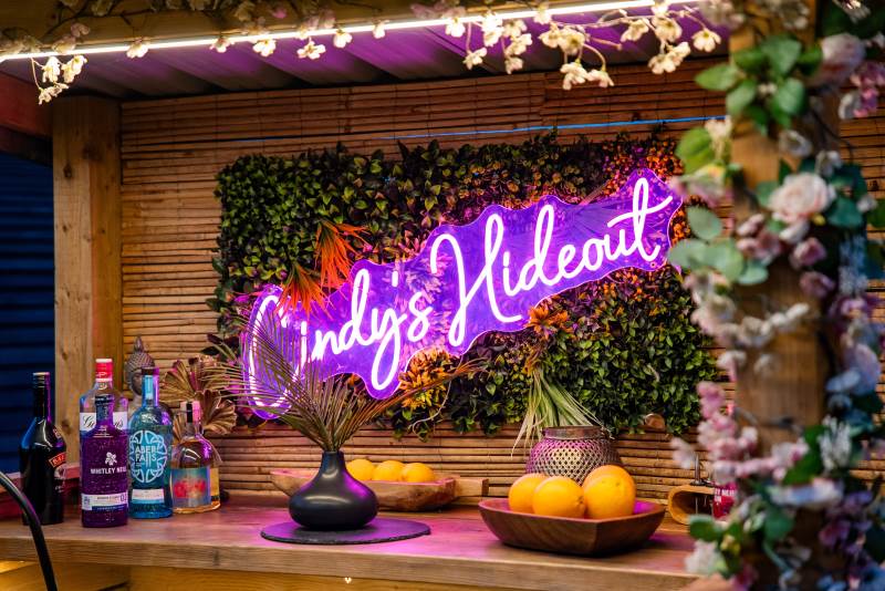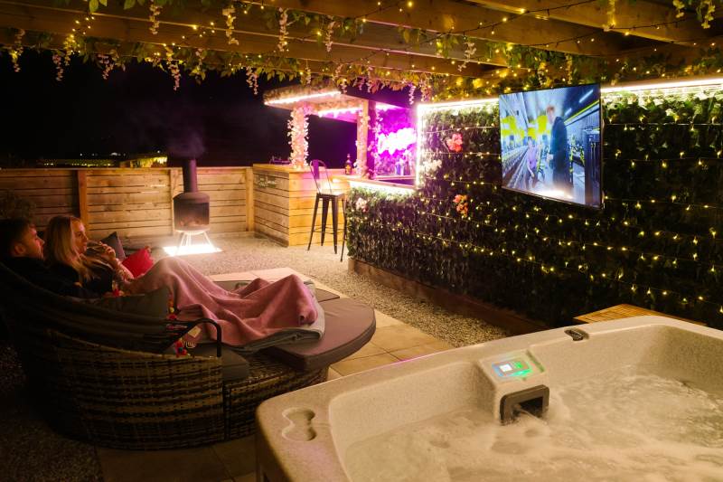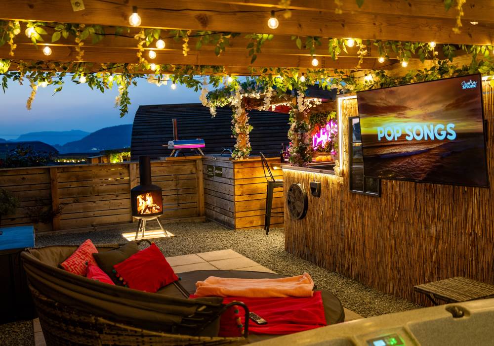 Cindy's Hideout is one of our exquisite VIP pods, offering a private terrace complete with a new, stylish bar area, vibe lighting, and an outdoor smart TV. Unwind in the hot tub beneath a pergola adorned with fairy lights, or enjoy the BBQ area, fire pit, and comfy sofa with cozy throws and cushions. It’s the perfect spot to relax and watch the sunset.