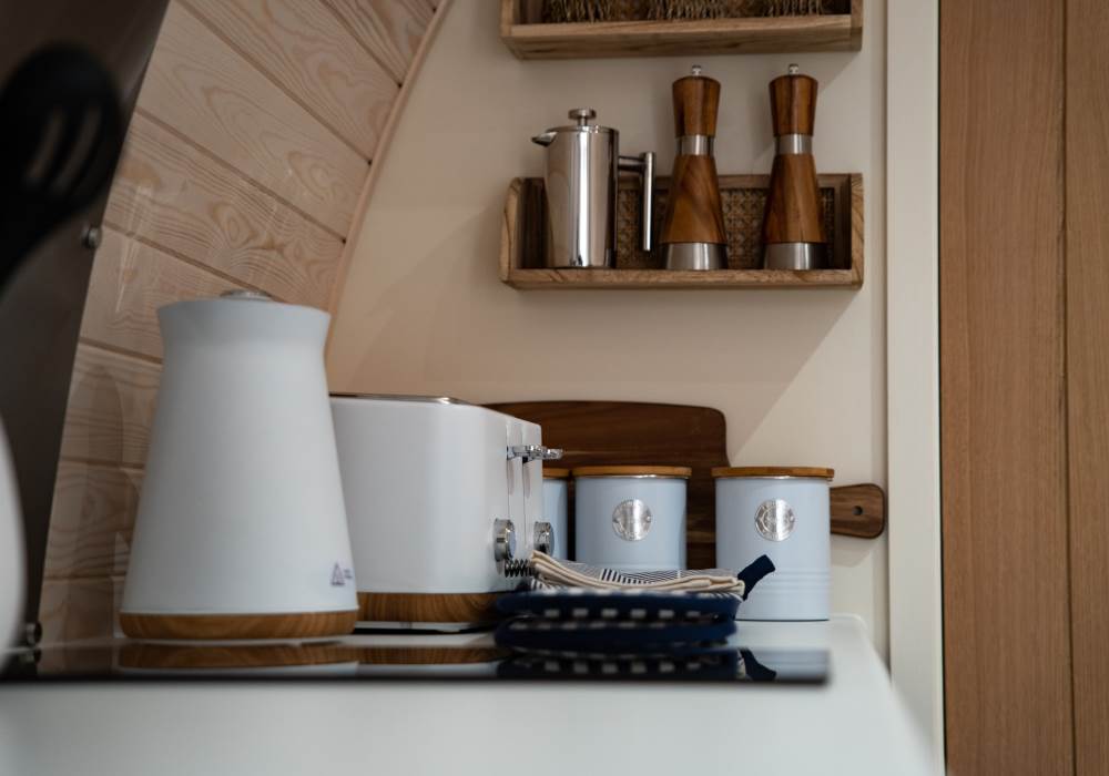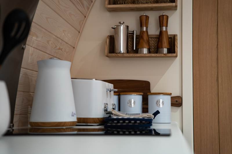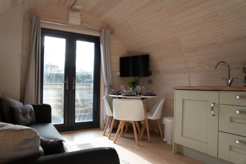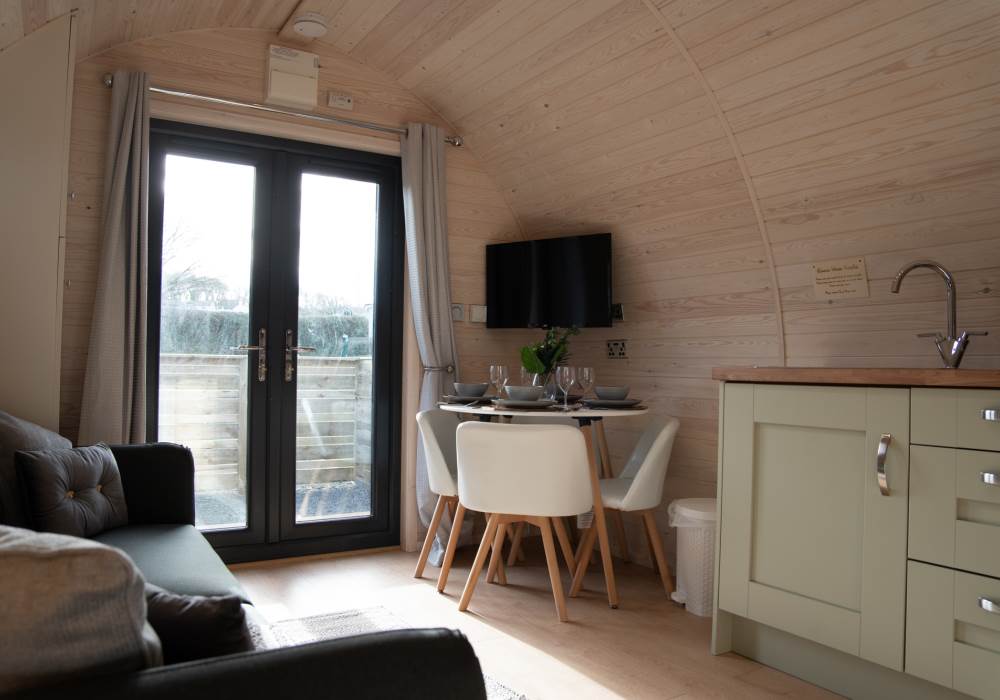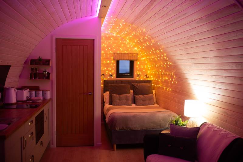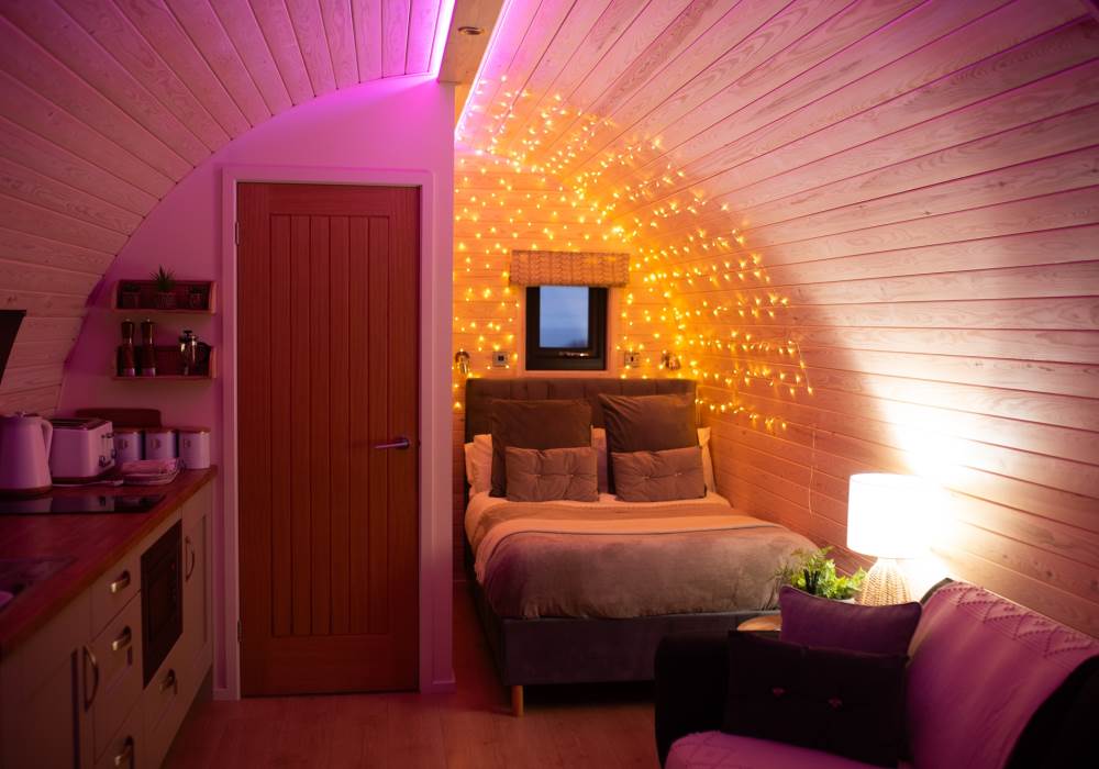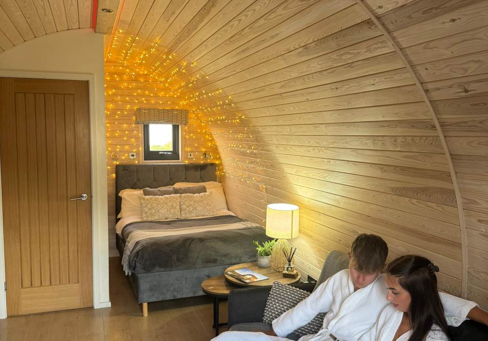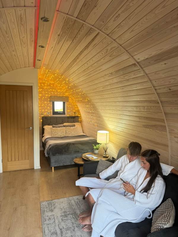Our brand new, exceptional VIP Pod features a fully equipped kitchen with a two-ring hob, built-in microwave, fridge, and TV. The double bed comes with luxurious linen, and there’s a comfortable sofa in the lounge area. Central heating ensures comfort, and the ensuite includes a toilet, shower, fluffy towels, and dressing gowns.