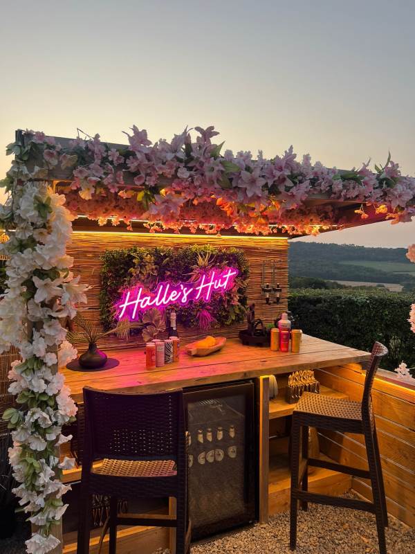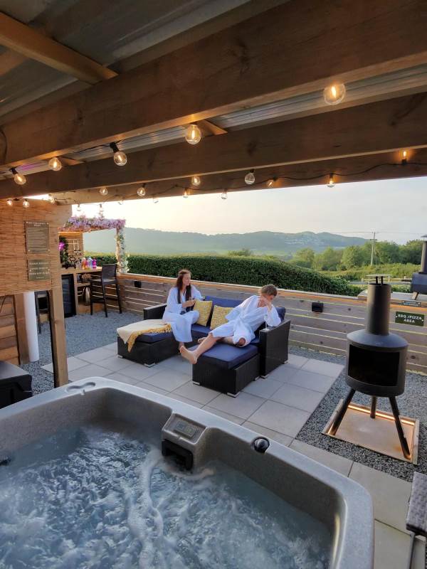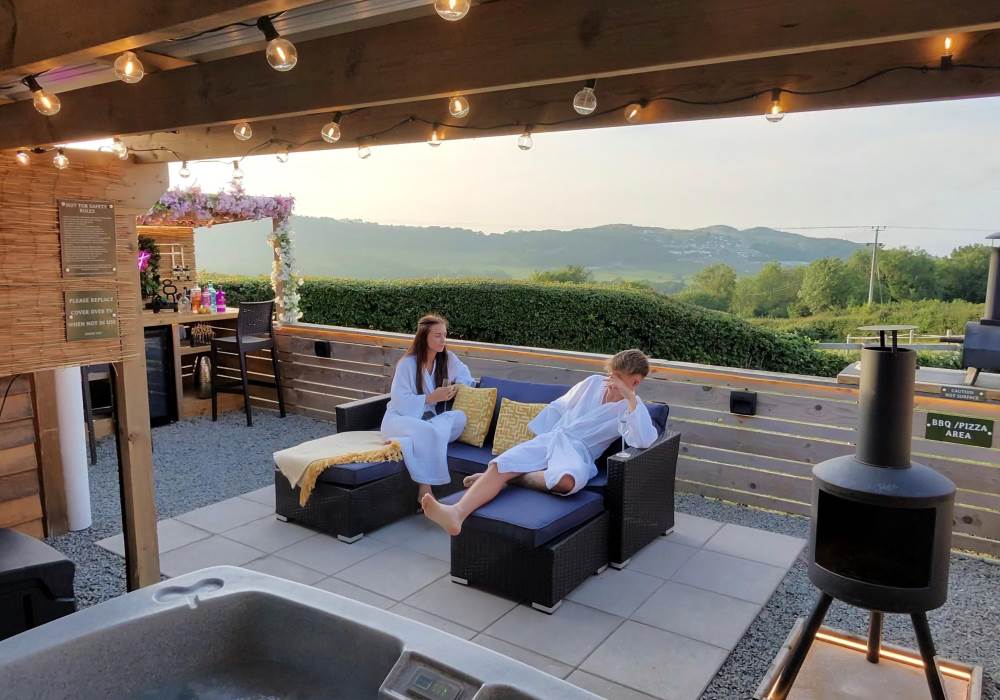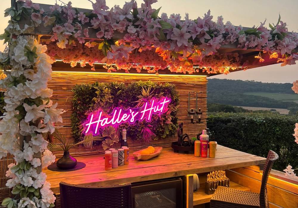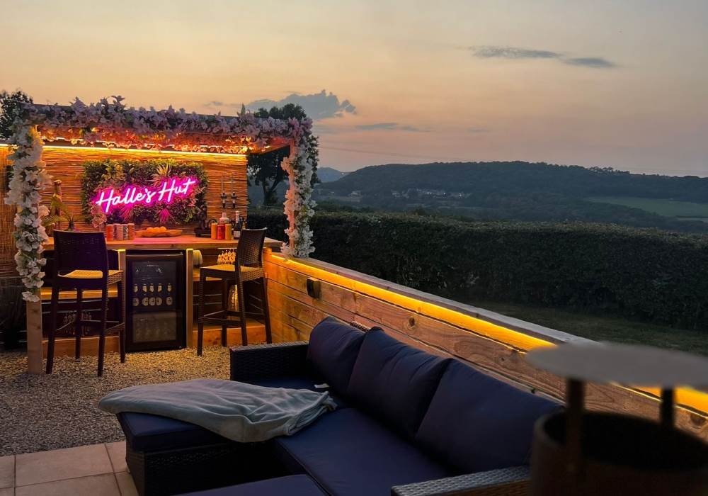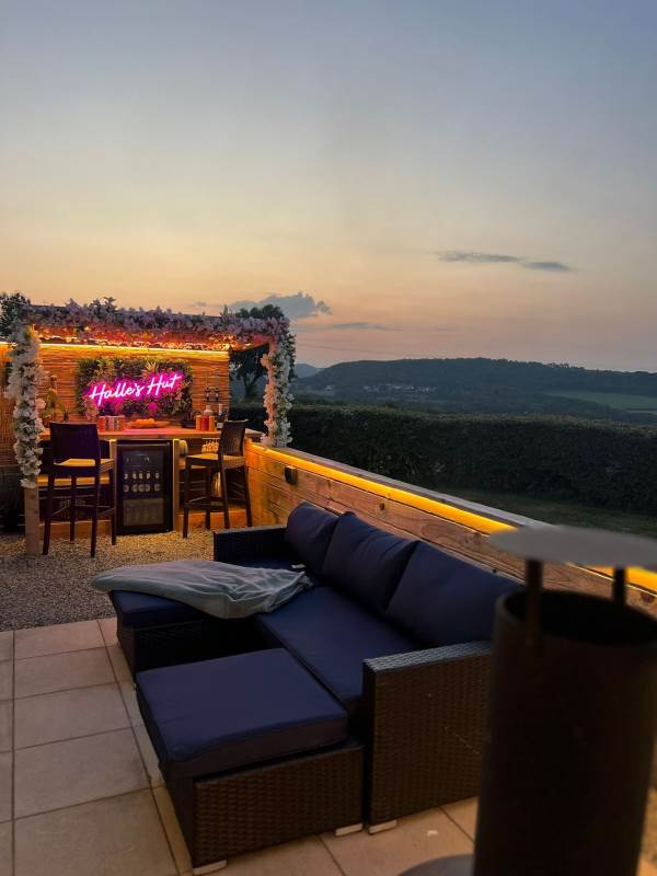 The pod also boasts a stylish new bar area with bar stools, mood lighting, and neon accents. The hot tub, nestled under a pergola and surrounded by flower walls illuminated with fairy lights, provides the perfect spot to unwind. Enjoy the large rattan sofa, fire pit, and pizza oven, all while taking in the breathtaking views. An additional seating area with a dining table and chairs offers the ideal place to relax and enjoy the evening sunsets. We provide tea, coffee, sugar, and biscuits for your convenience.