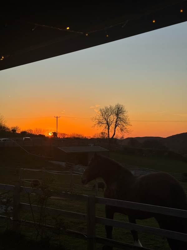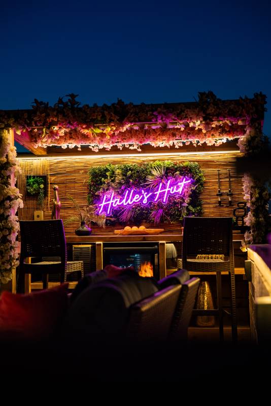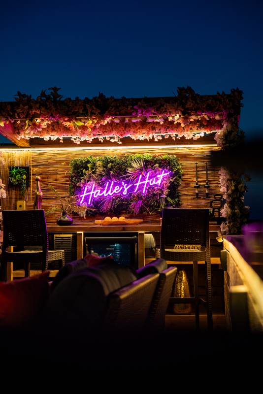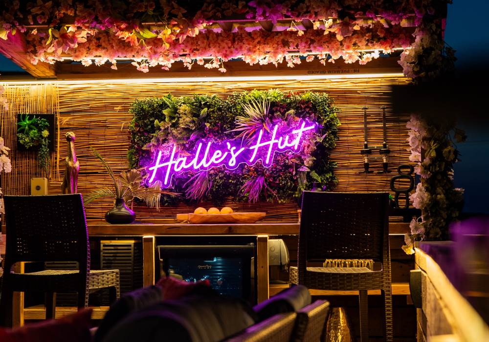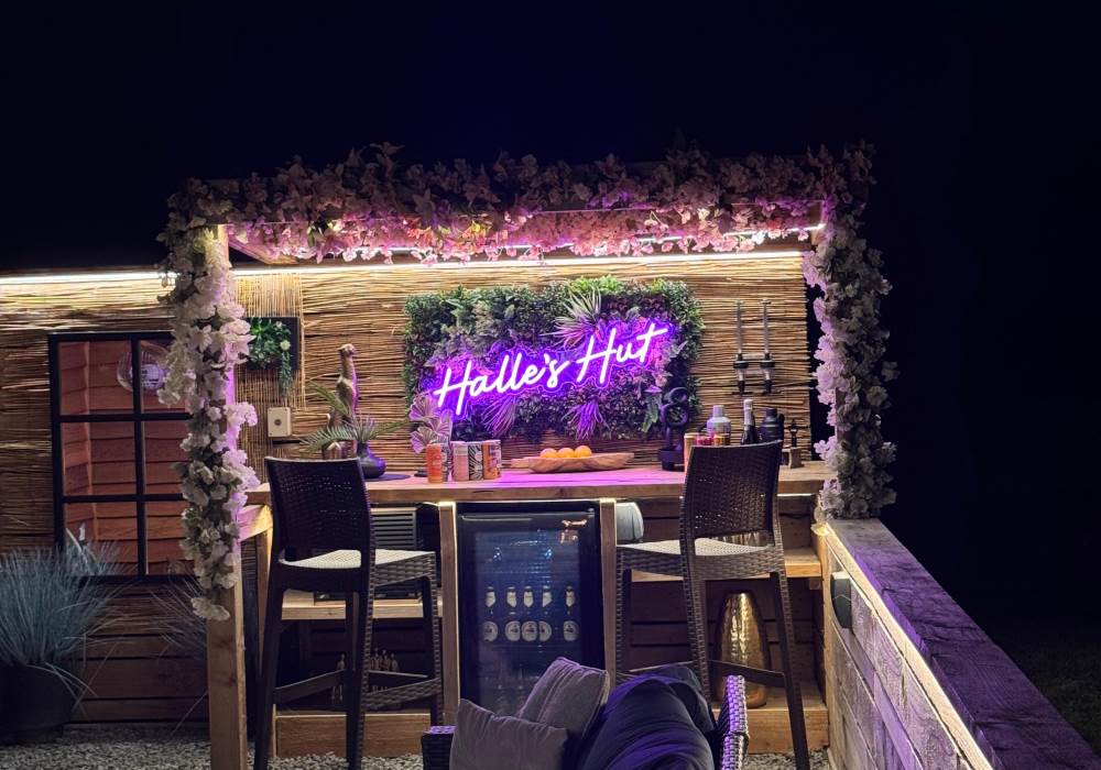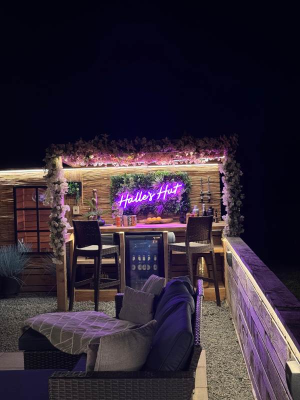 The pod also boasts a stylish new bar area with bar stools, mood lighting, and neon accents. The hot tub, nestled under a pergola and surrounded by flower walls illuminated with fairy lights, provides the perfect spot to unwind. Enjoy the large rattan sofa, fire pit, and pizza oven, all while taking in the breathtaking views. An additional seating area with a dining table and chairs offers the ideal place to relax and enjoy the evening sunsets. We provide tea, coffee, sugar, and biscuits for your convenience.