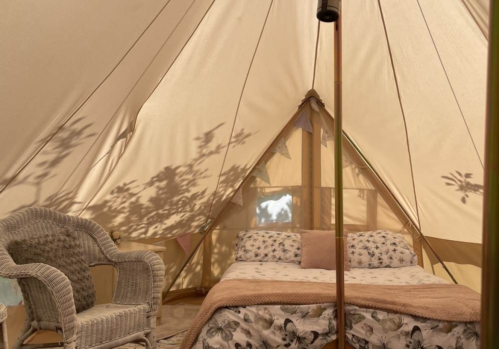 The traditional Bell Tents have a sumptuous double bed and up to 3 single beds. This spacious bell will sleep 4 adults or 2 adults and up to 3 children and fits the bill for most families