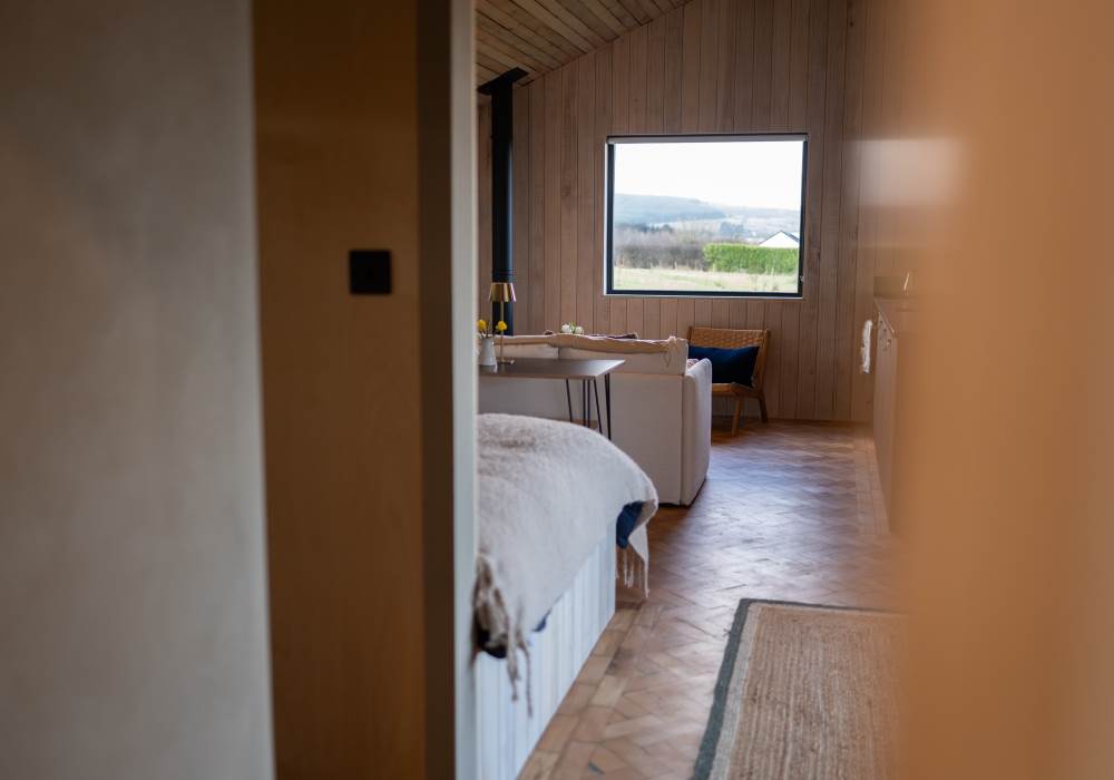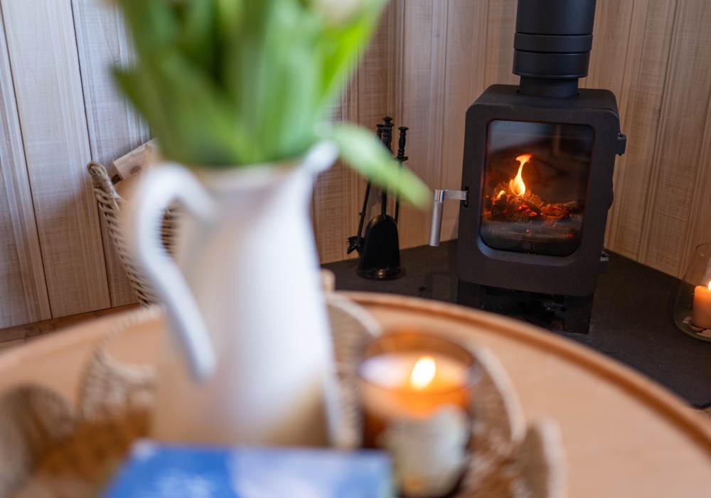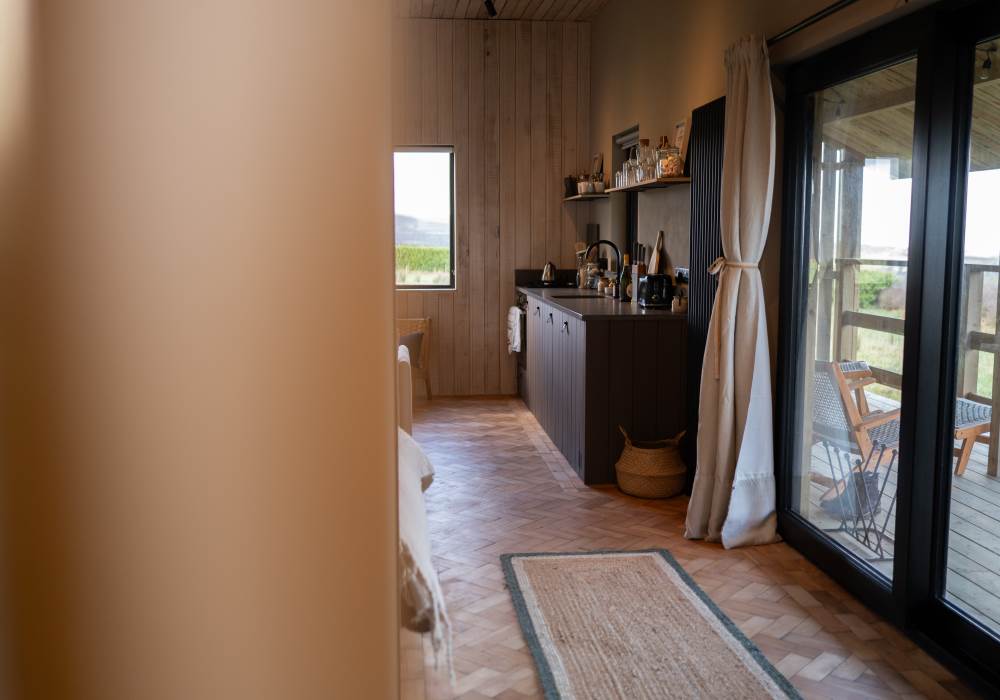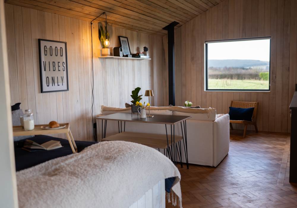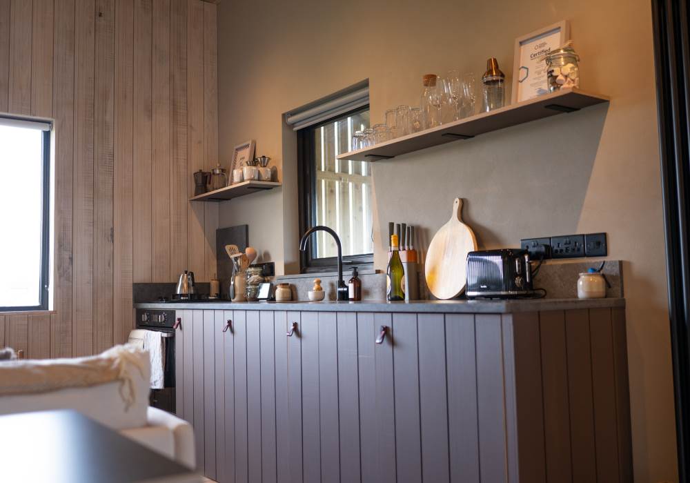 The open plan cabin design ensures you can continuously enjoy breath taking coastal views as the living, sleeping and kitchen area are all-in-one. This peaceful area has everything you need: a comfy sofa to curl up on with a good book, WiFi and a projector for film nights, a selection of books and games and cosy wood-burner stocked with logs, kindling, firelighters and matches.