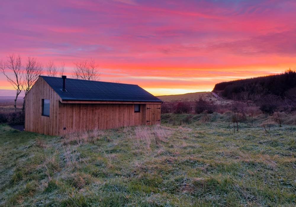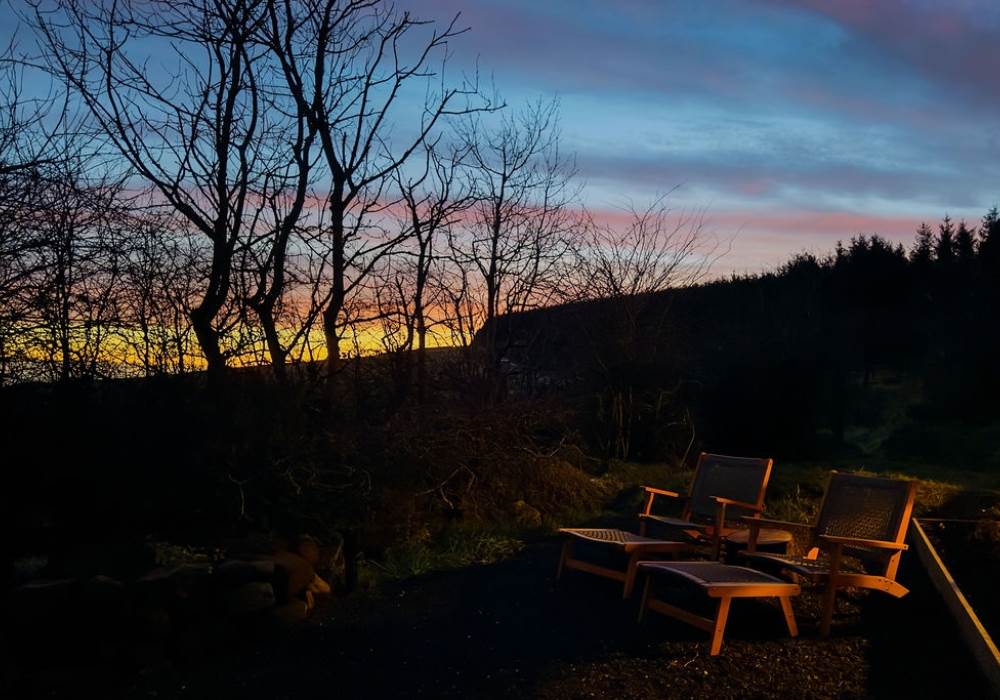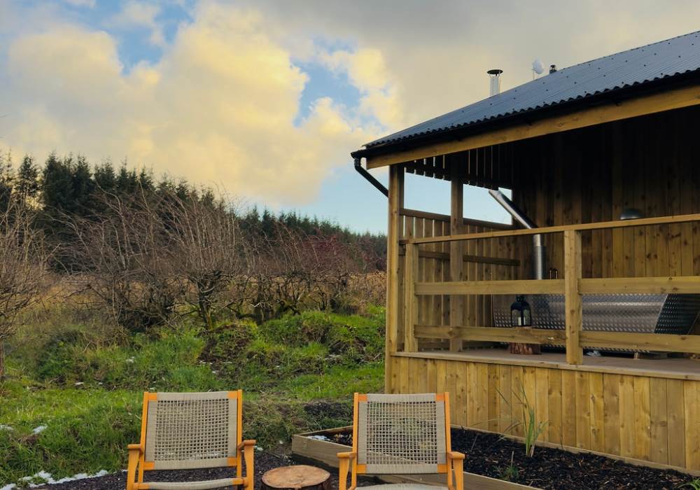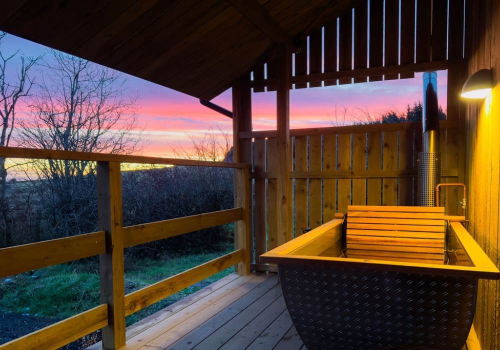 A covered veranda spreads across the entire front of the cabin meaning even in the pouring rain you can cosy up under a blanket on the outdoor seating, warm and dry. Blissfully soak and unwind in the wood-fired outdoor bath under the veranda. The bathtub has the most beautiful panoramic coastal views with the North Atlantic ocean spread out in front of you, on clear nights the Northern Lights can be spotted and Scotland’s northern islands peak through the horizon. Cook a hearty breakfast, or toast marshmallows on the outdoor firepit with outdoor seating. Open fire cooking equipment included.