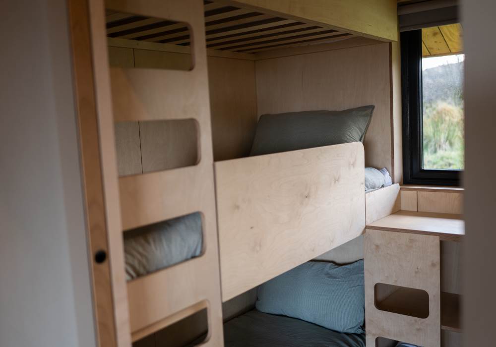 The separate bunkroom boasts three single bunkbeds – designed for a memory making family cabin adventure.