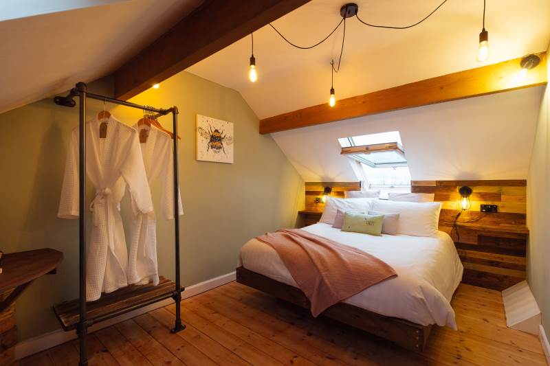 It's topsy-turvy layout finds the bathroom & kitchen on the ground floor. Upstairs is a large living area & a bedroom with a king size bed.