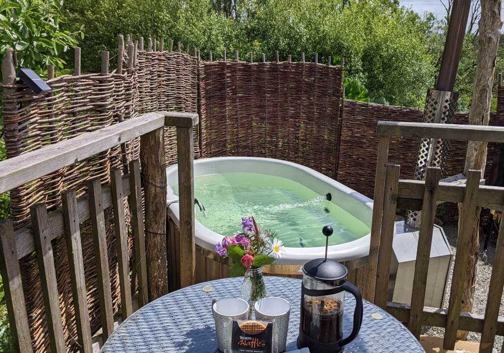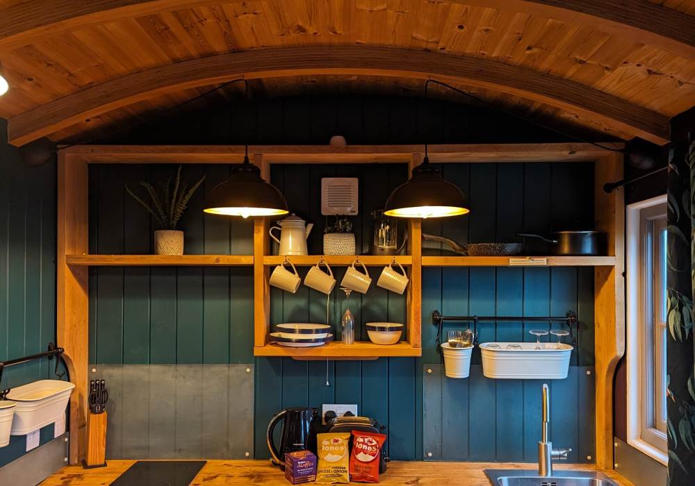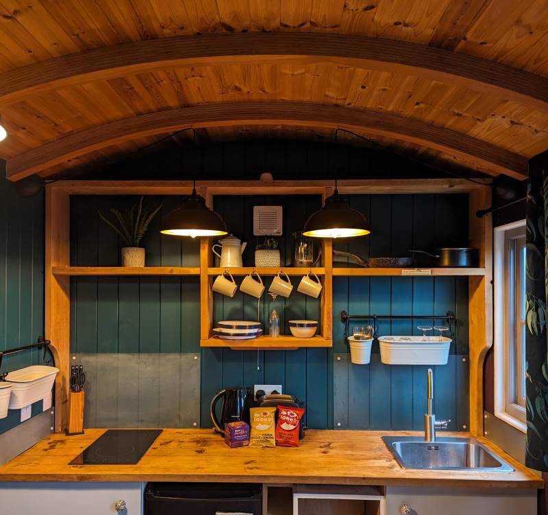 The bed is raised for you to enjoy the view of the pond on lazy mornings. Wren also has a kitchen and seating area with folding table should you want to eat inside. The compact kitchen includes a 2 ring hob, kettle, toaster, fridge & sink, plus all the crockery, cutlery & glasses you should need.