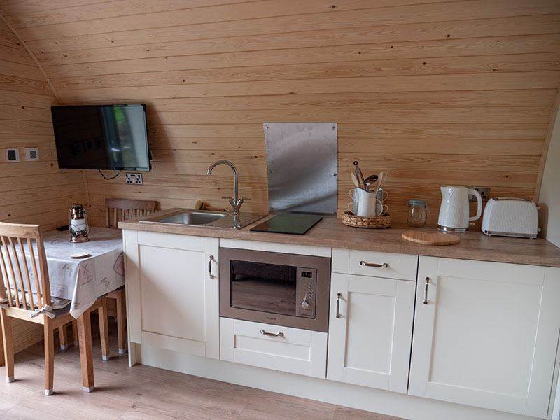 A kitchenette area, which includes sink, combi microwave/grill/oven, fridge, kettle, toaster. Also includes crockery and cutlery etc.