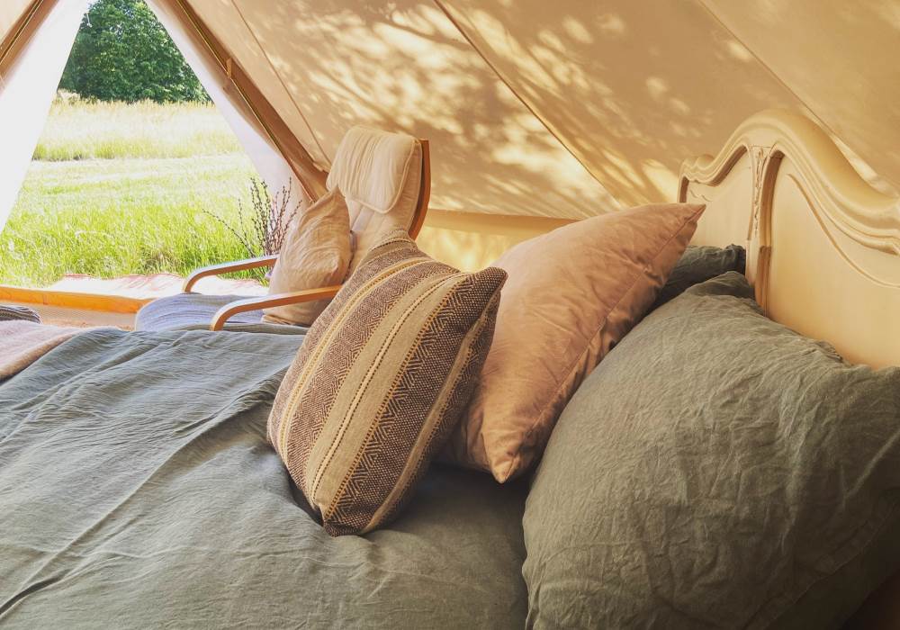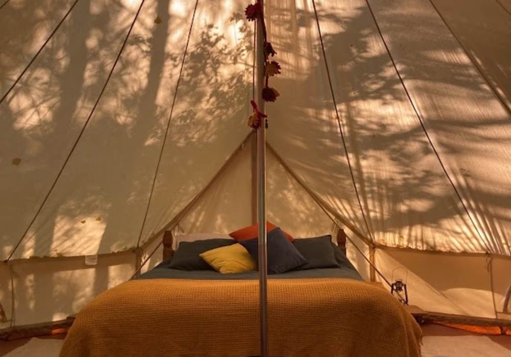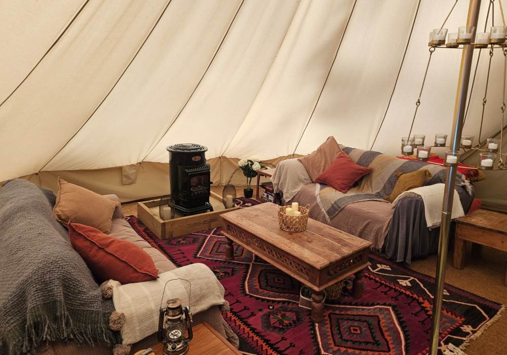 - There are three 6 metre bell tents, each with a king sized bed and two singles as standard, all bedding and towels provided. All the sleeping tents have heaters for the cooler months. Our beautifully styled 8 metre lounge tent has comfy sofas set round a gas burner fire, and space for three more camp beds if needed. We will set up the site as per the needs of your group.
