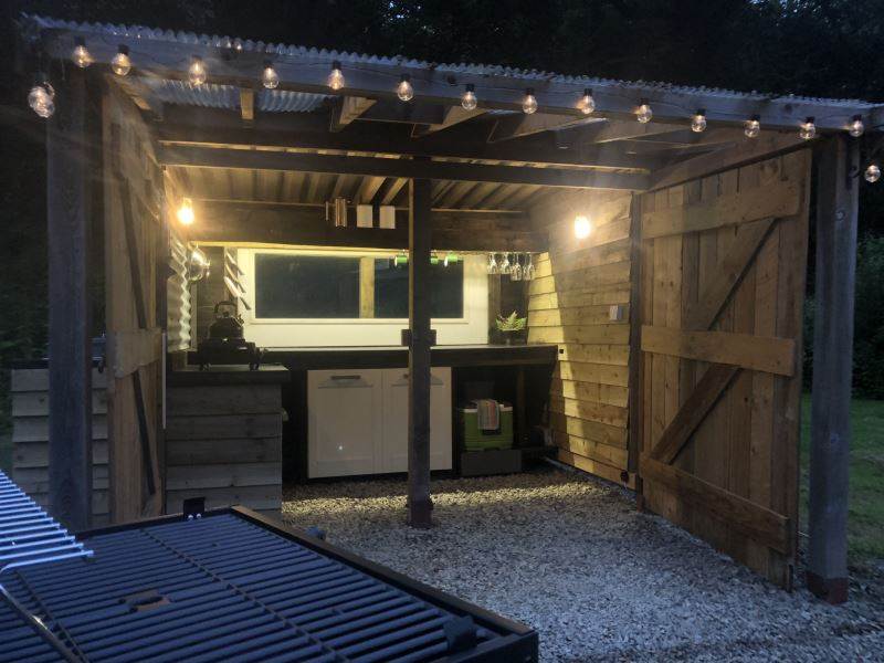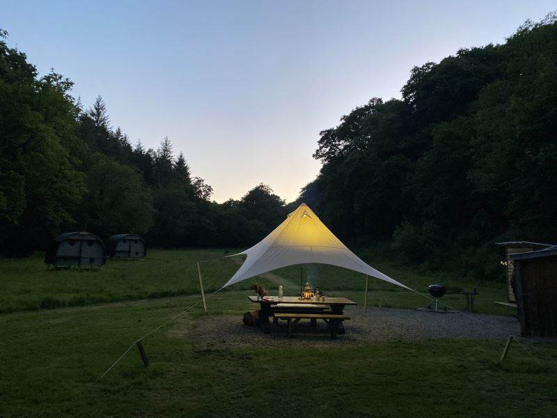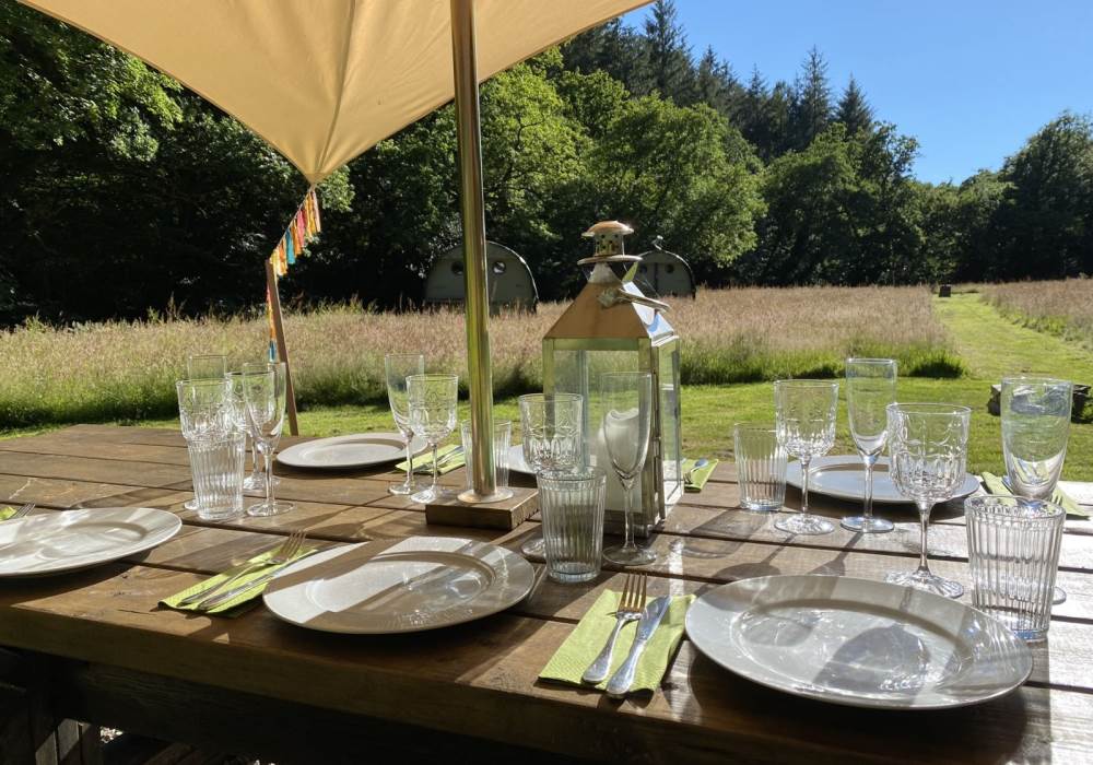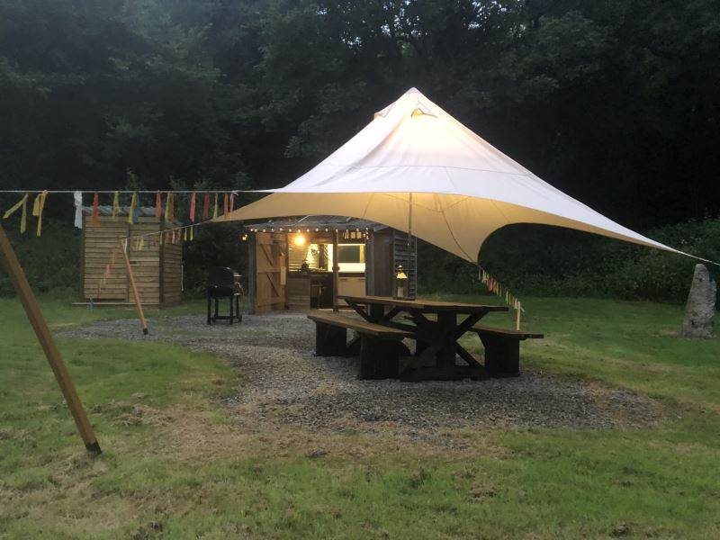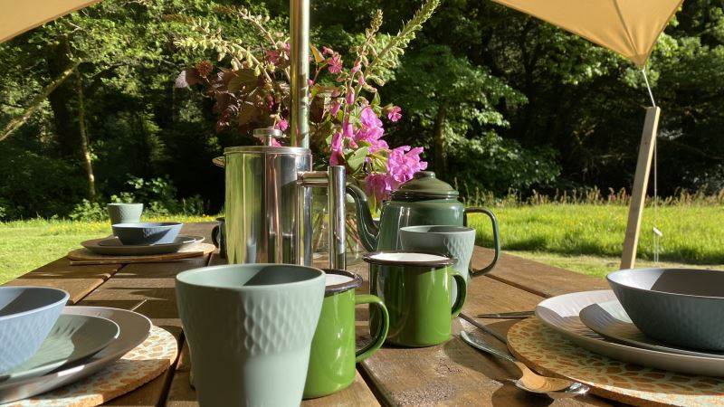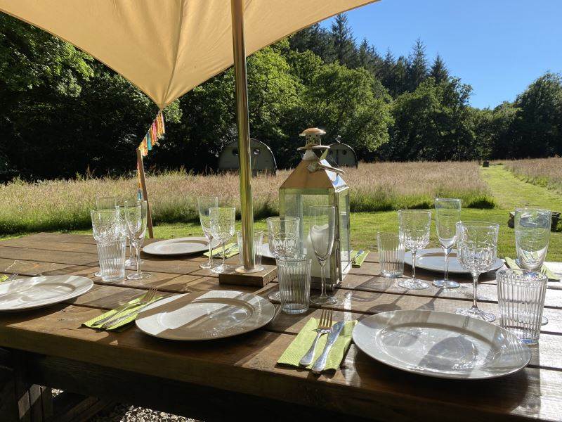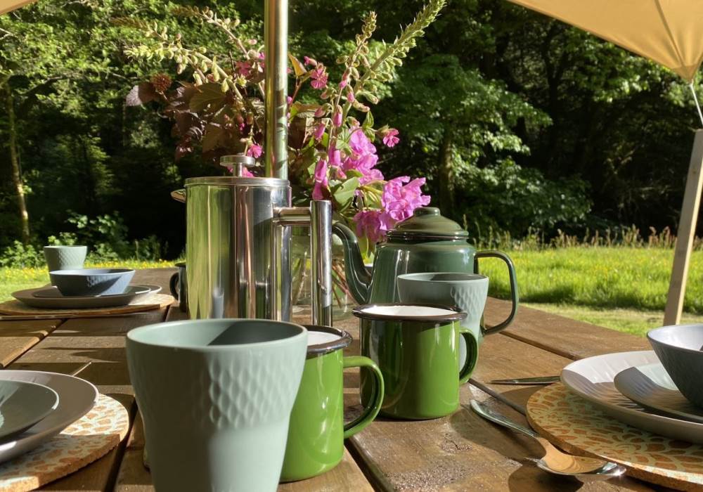 The field kitchen, has a two ring gas burner, BBQ, cool box, cooking utensils, kettle, teapot, cafetiere, cups, plates, bowls, glasses and cutlery for the number of guests staying. There is also a canvas covered dining table that comfortably seats 8 for alfresco dining.