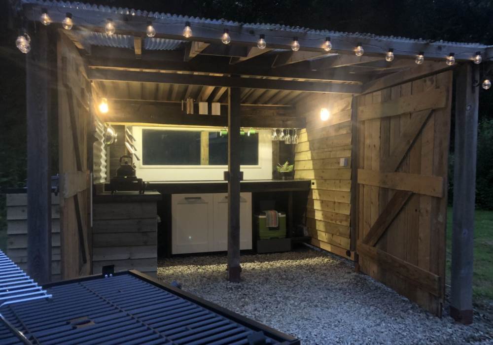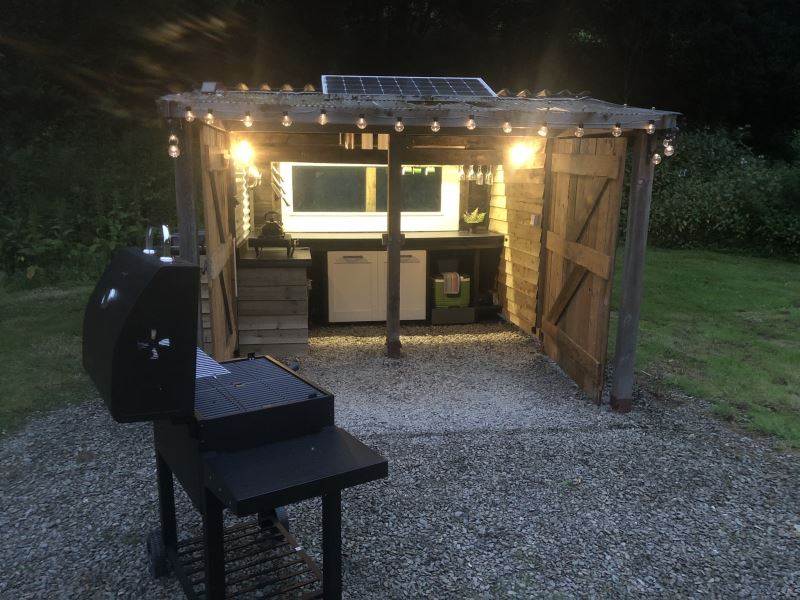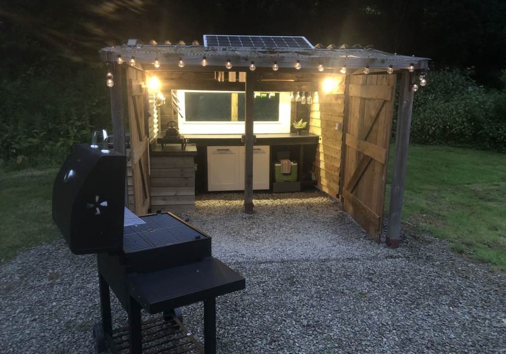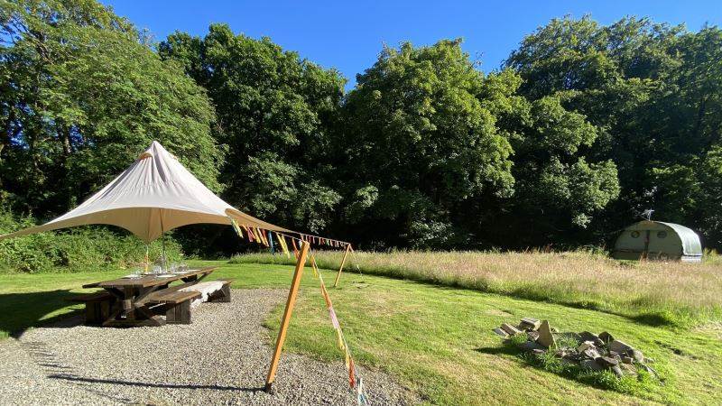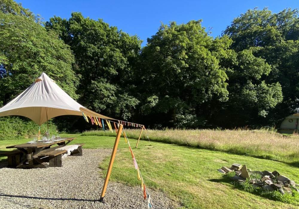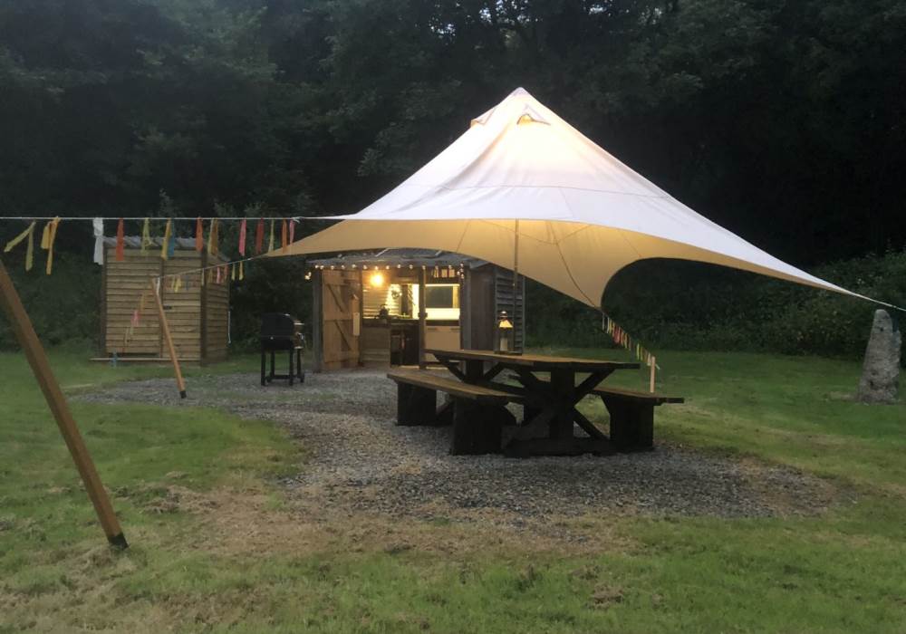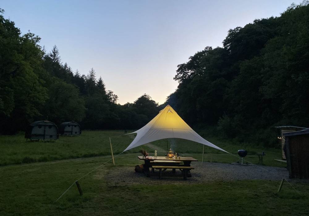 The field kitchen, has a two ring gas burner, BBQ, cool box, cooking utensils, kettle, teapot, cafetiere, cups, plates, bowls, glasses and cutlery for the number of guests staying. There is also a canvas covered dining table that comfortably seats 8 for alfresco dining.