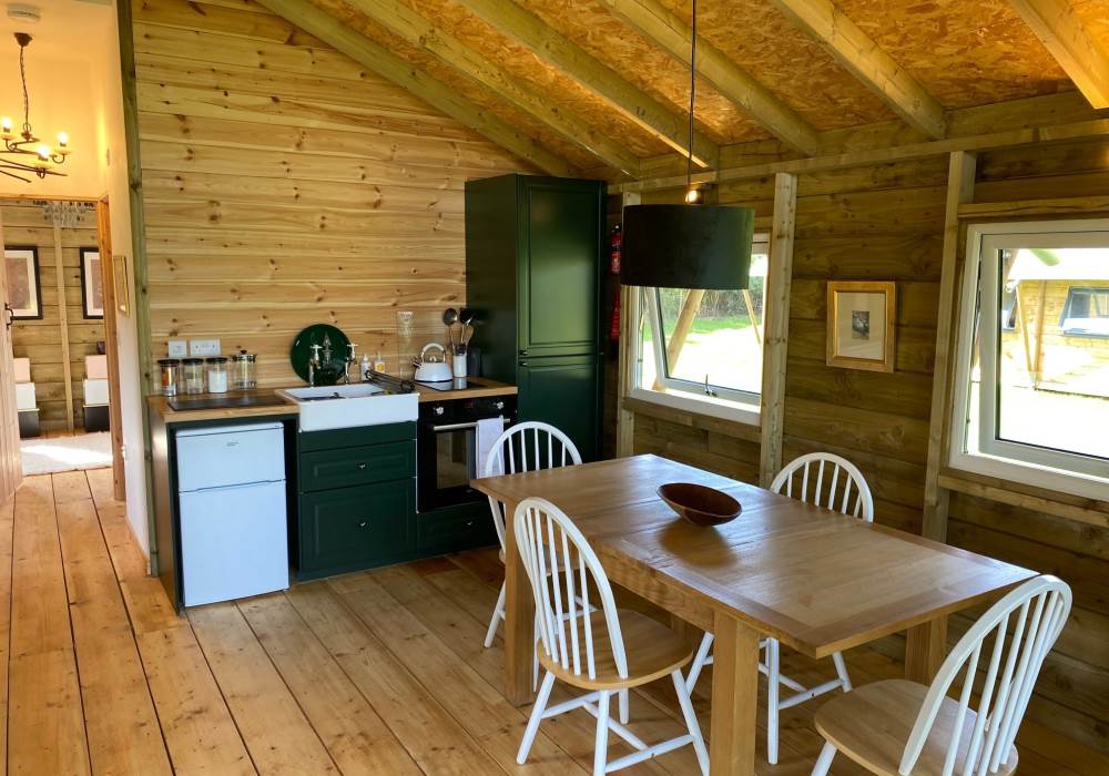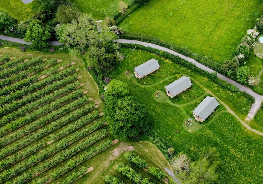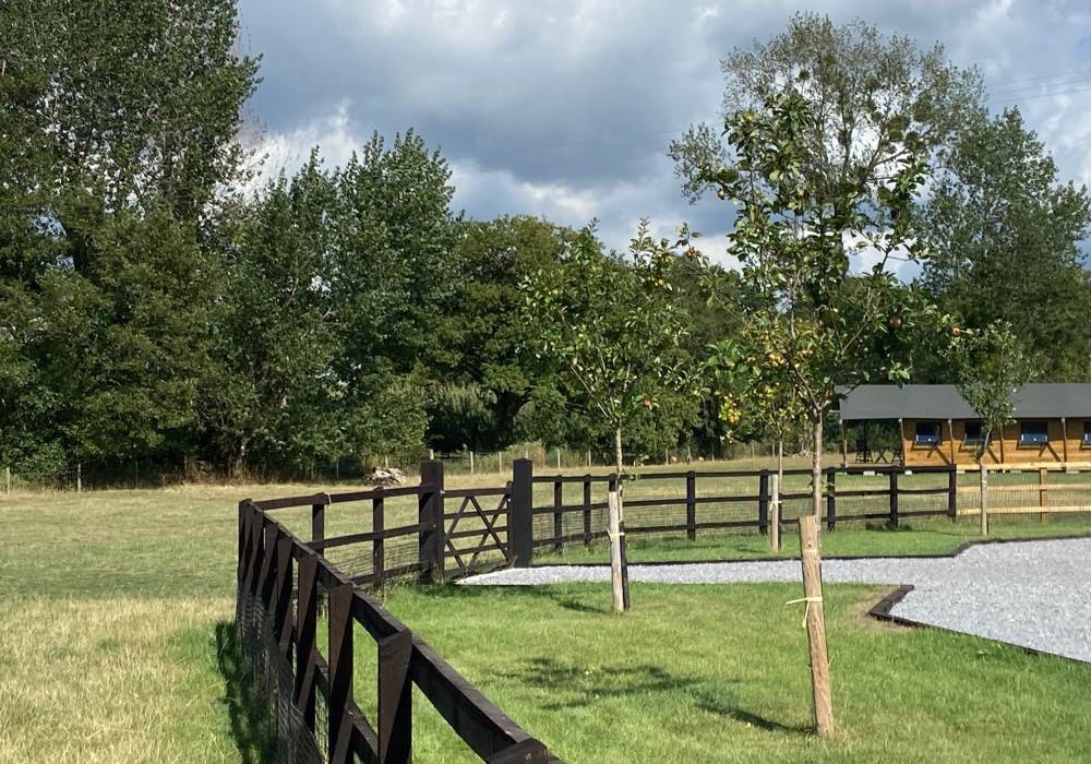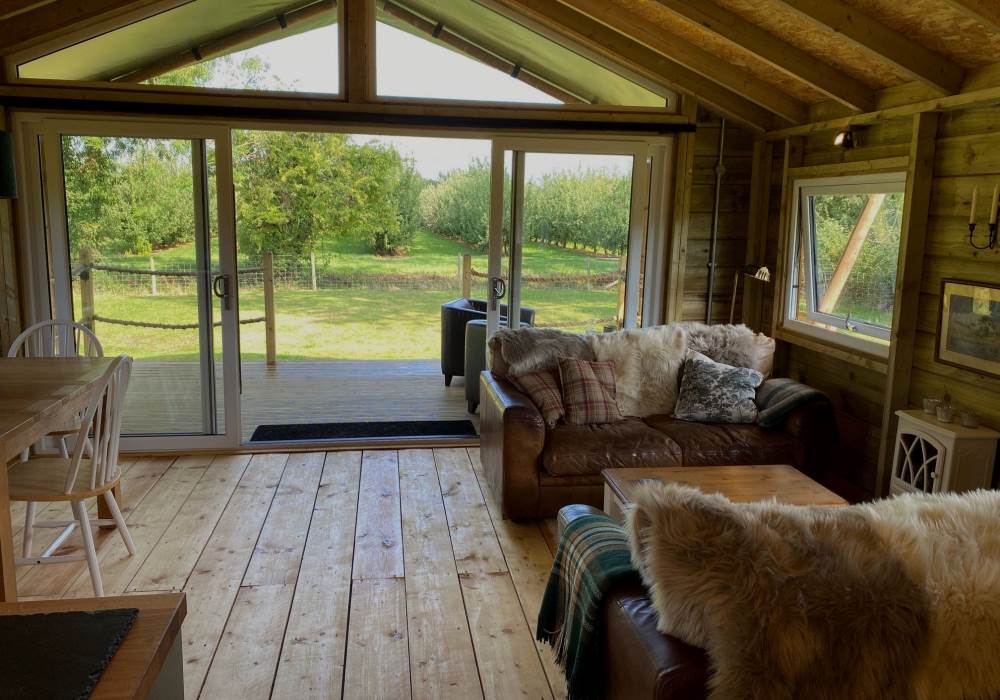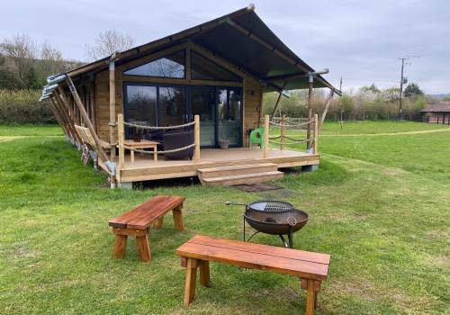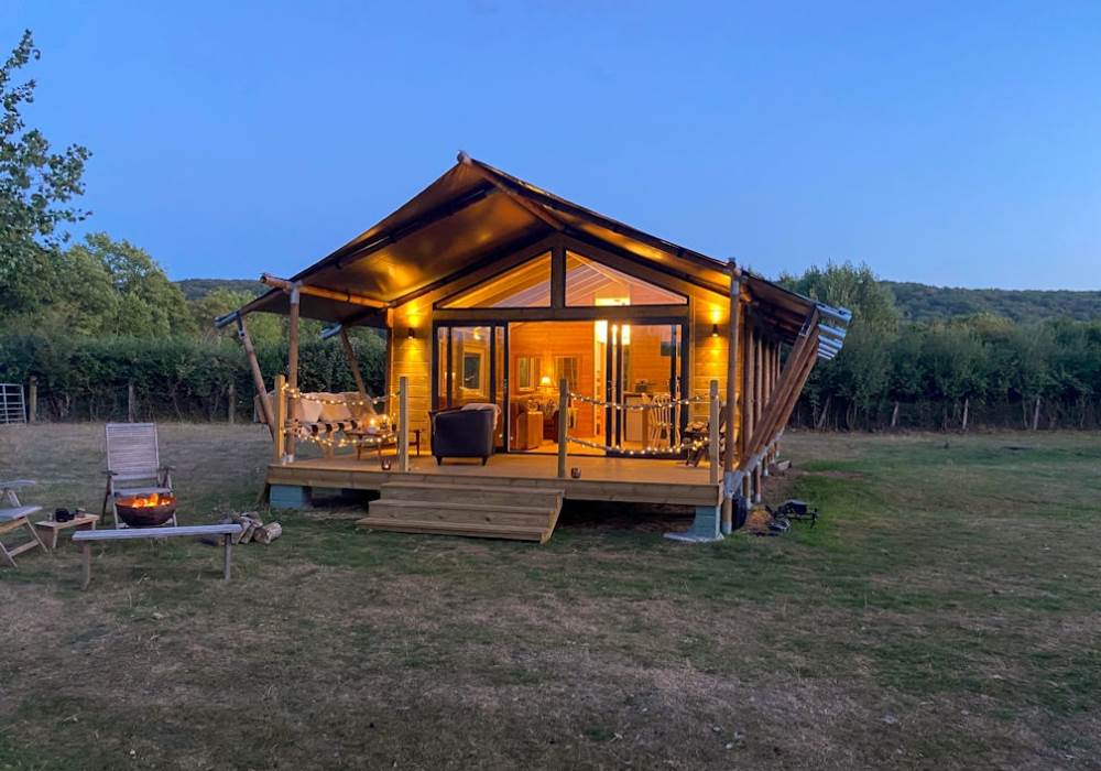 A COSY TIMBER SAFARI LODGE, SURROUNDED BY MEADOW AND ORCHARDS, NESTLING IN THE HEART OF SOMERSET.